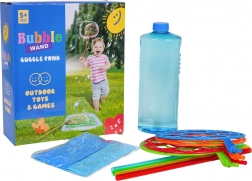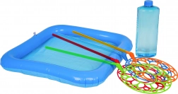 Genießen Sie Outdoor-Spaß mit dem Set für riesige Seifenblasen für Kinder ab 5 Jahren. Das Set ist einfach zu verwenden, enthält 4 farbige Ringe, eine Flasche mit Lösung und ein aufblasbares Becken für die Flüssigkeit. Perfektes Spiel für Garten, Park und Urlaub.