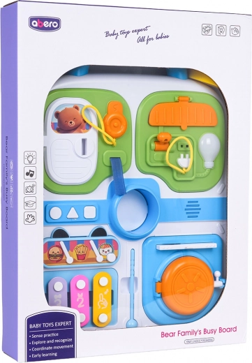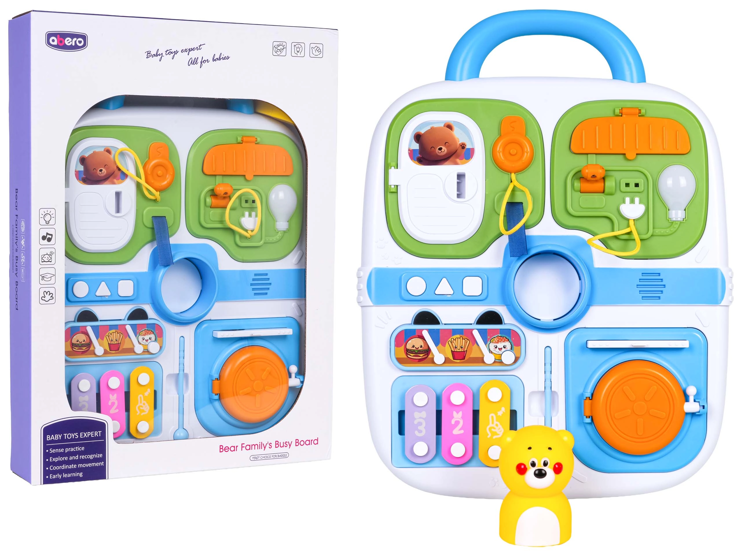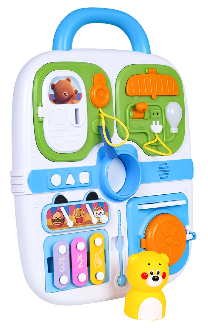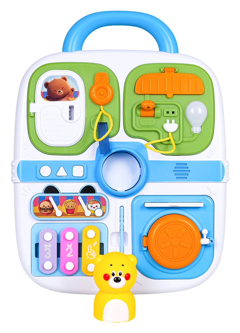 Dieser blaue Beschäftigungskoffer ist die ideale Wahl für kleine Entdecker. Er bietet eine bunte Vielfalt an Aktivitäten, die die kindliche Neugier anregen – von Türchen mit Schlüssel über ausziehbare Elemente und Drehregler bis hin zum Lichteffekt der Lampe nach dem Einstecken des Kabels. Der Bär in der Mitte quietscht beim Drücken und drei Tasten (Kreis, Dreieck, Quadrat) spielen Melodien und lustige Geräusche ab.