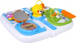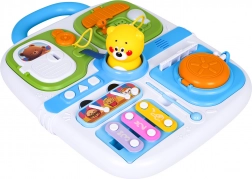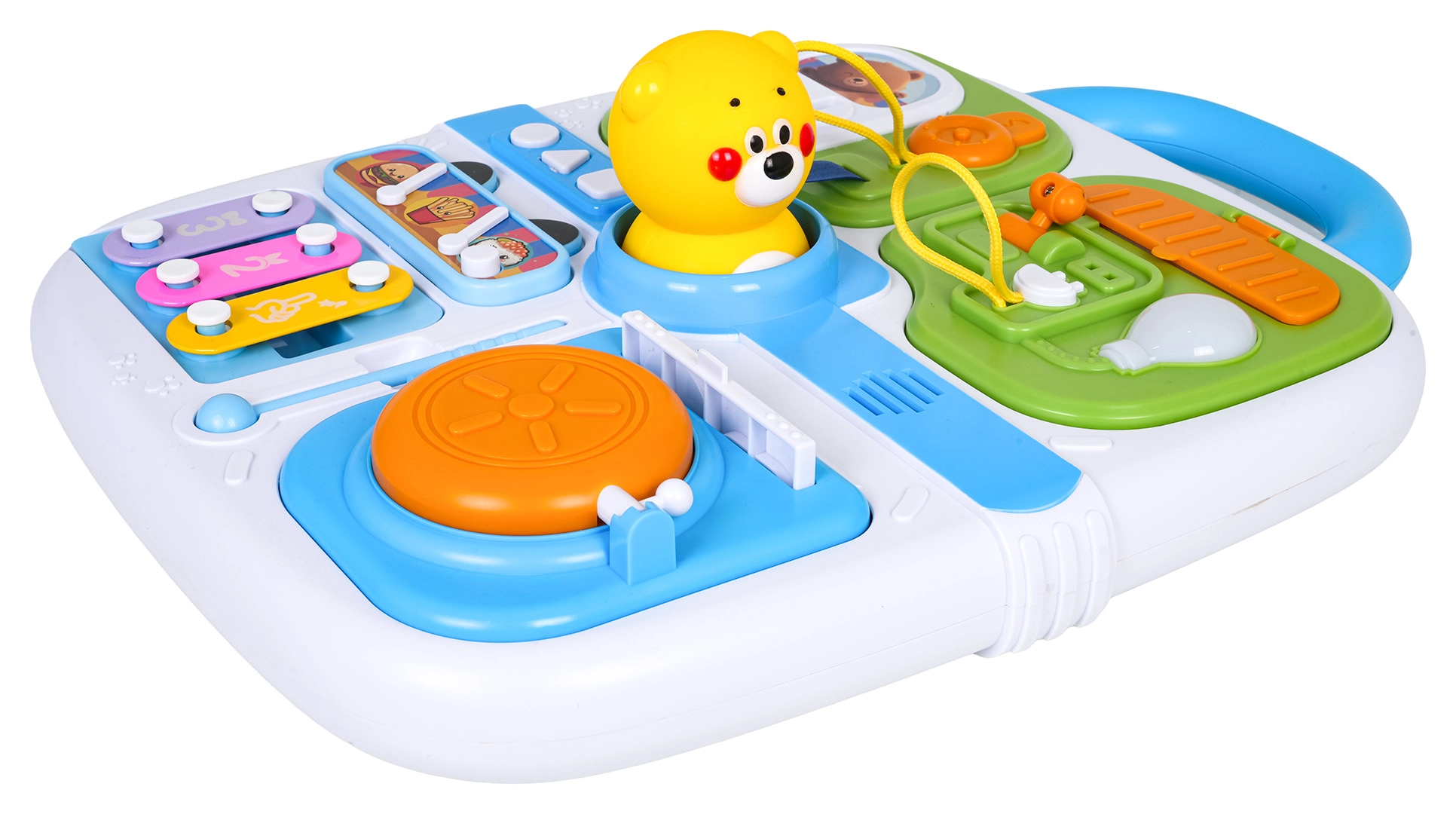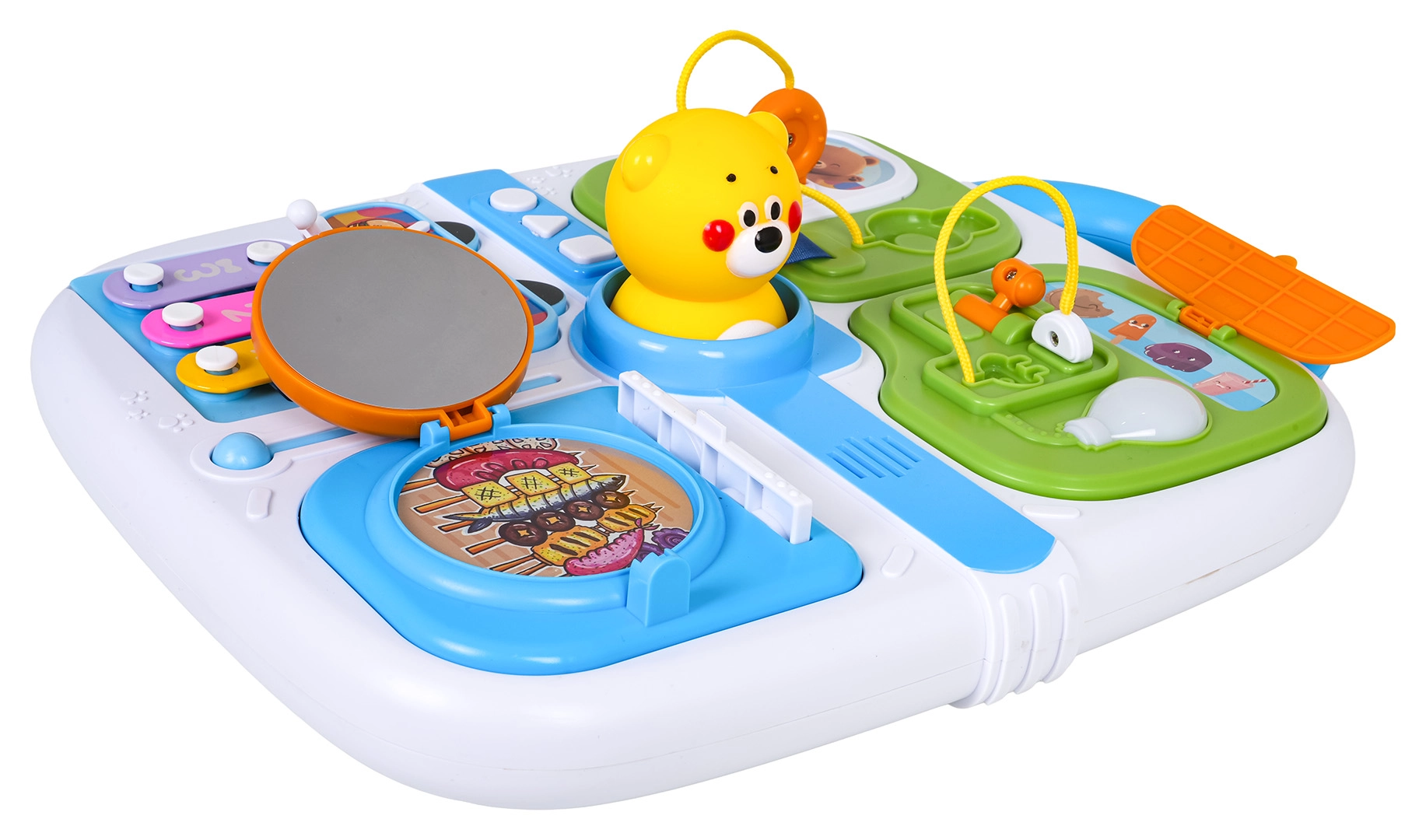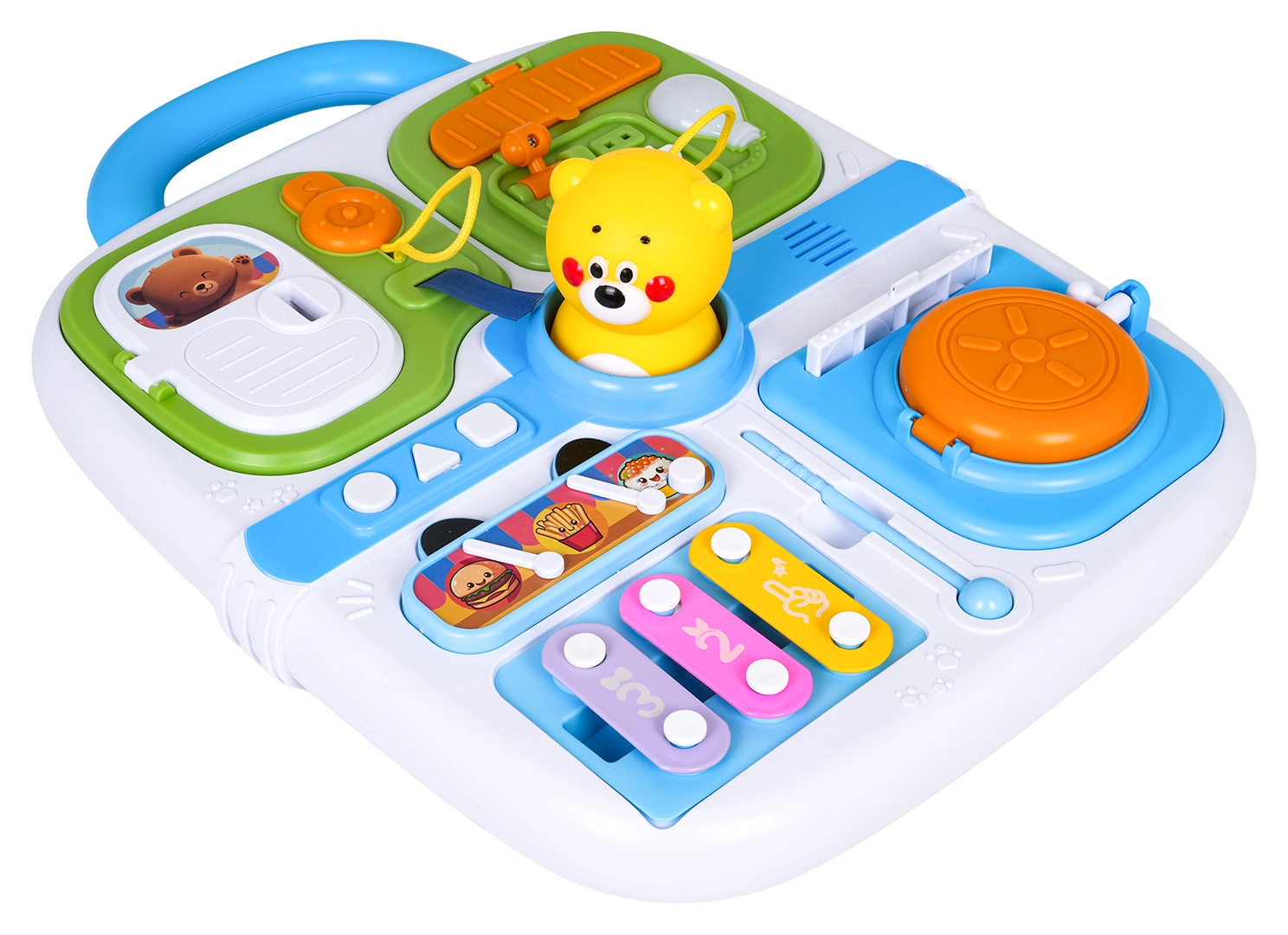 Dieser blaue Beschäftigungskoffer ist die ideale Wahl für kleine Entdecker. Er bietet eine bunte Vielfalt an Aktivitäten, die die kindliche Neugier anregen – von Türchen mit Schlüssel über ausziehbare Elemente und Drehregler bis hin zum Lichteffekt der Lampe nach dem Einstecken des Kabels. Der Bär in der Mitte quietscht beim Drücken und drei Tasten (Kreis, Dreieck, Quadrat) spielen Melodien und lustige Geräusche ab.