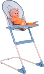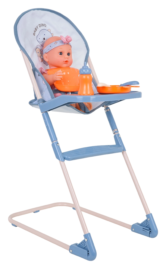 Komfortables Füttern dank Hochstuhl mit abnehmbarem Tablett und Set aus Besteck, Tellerchen, Lätzchen und Fläschchen. Ideal für realistische Pflegeszenarien.