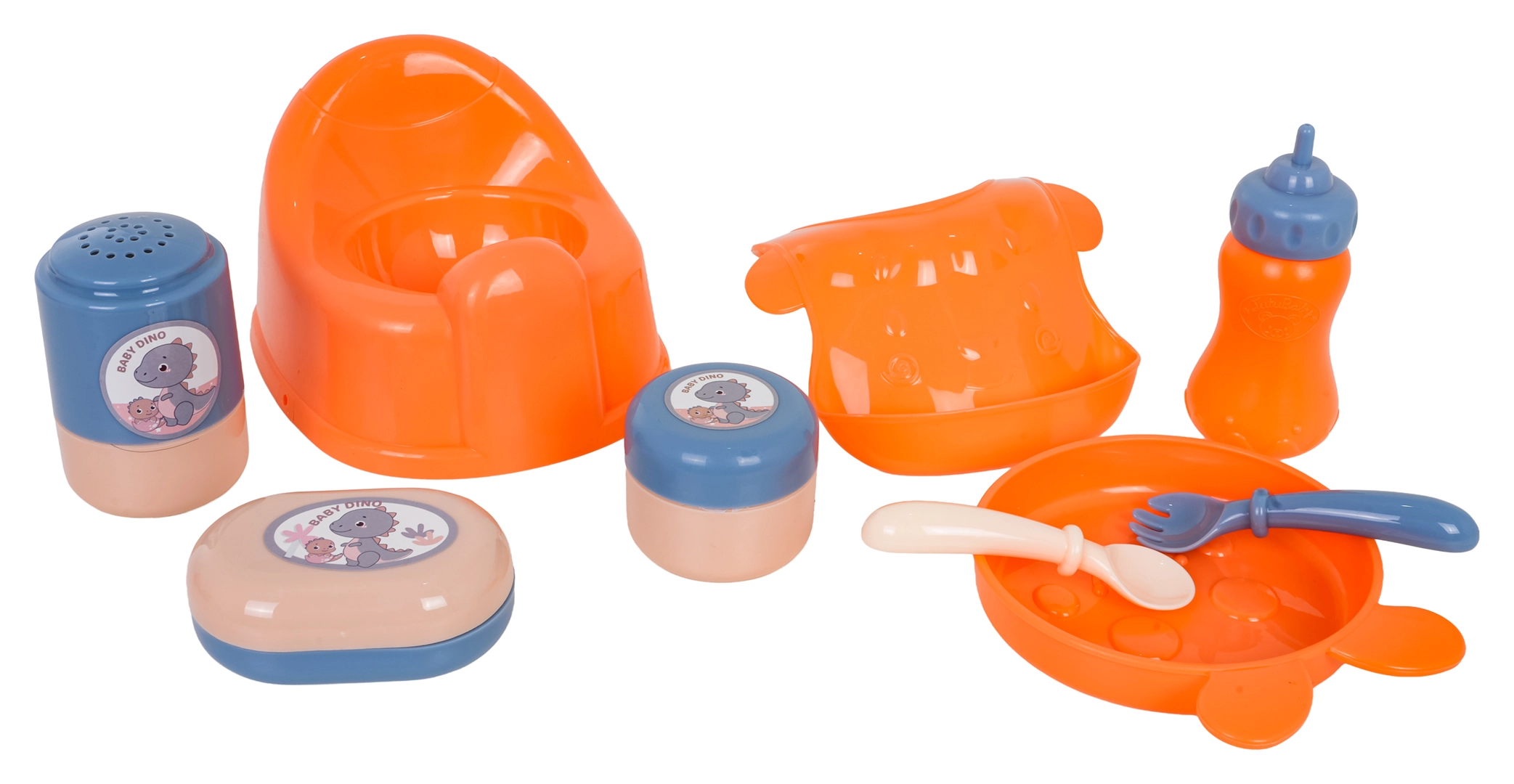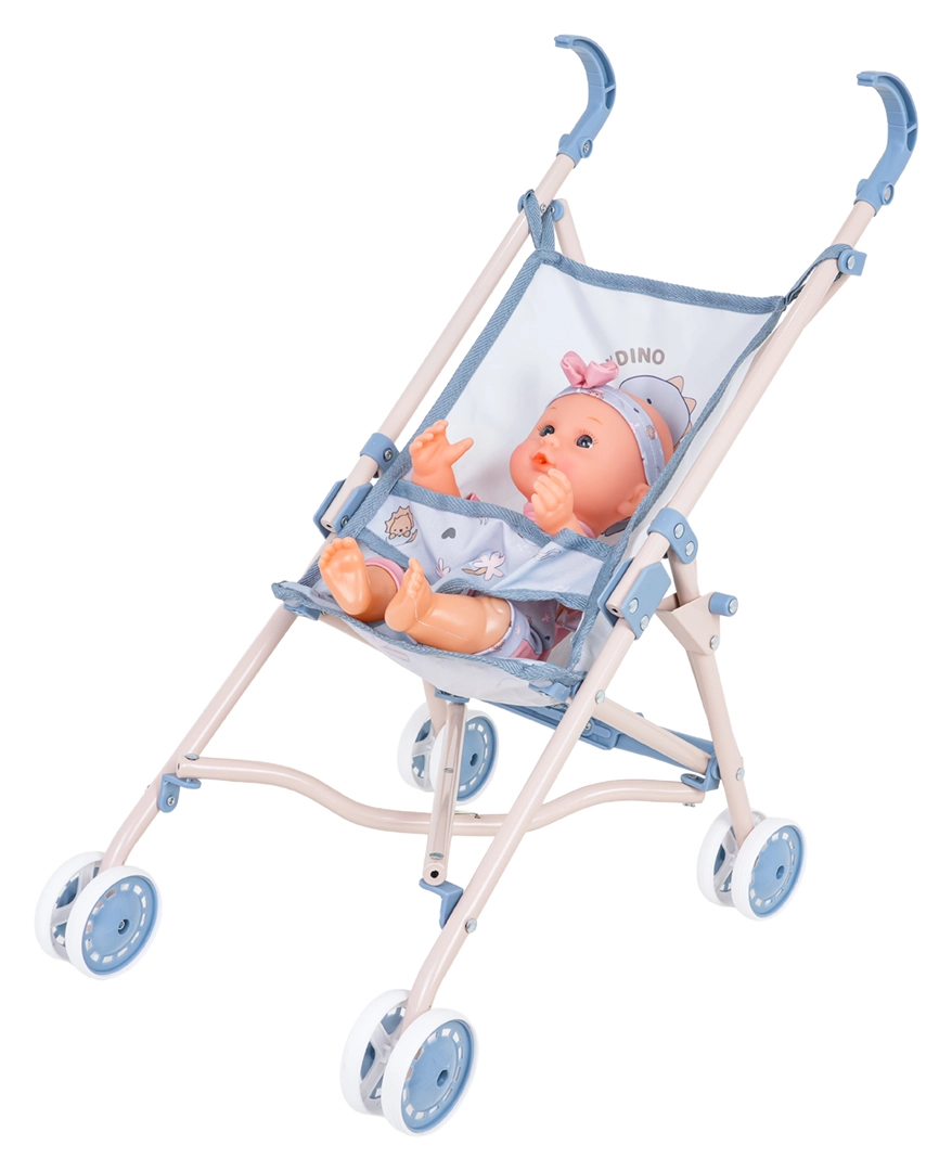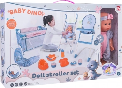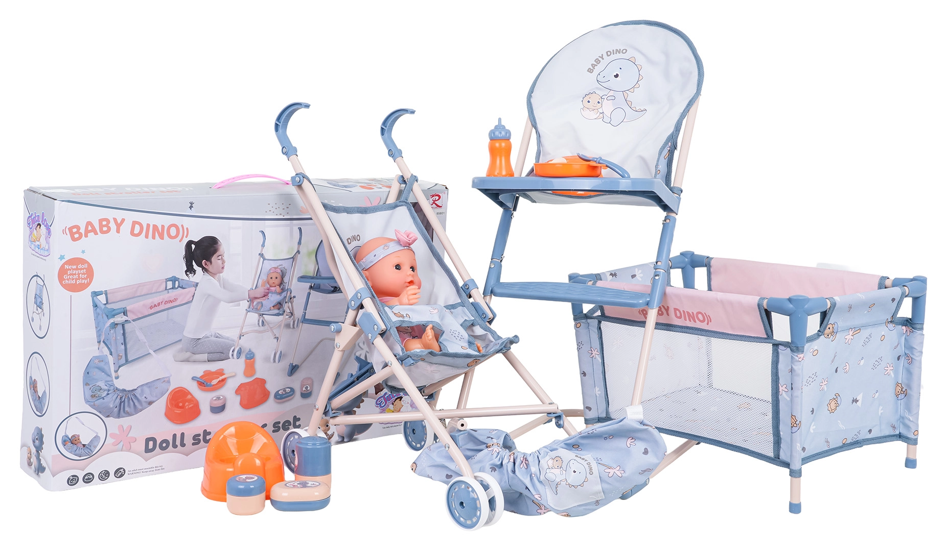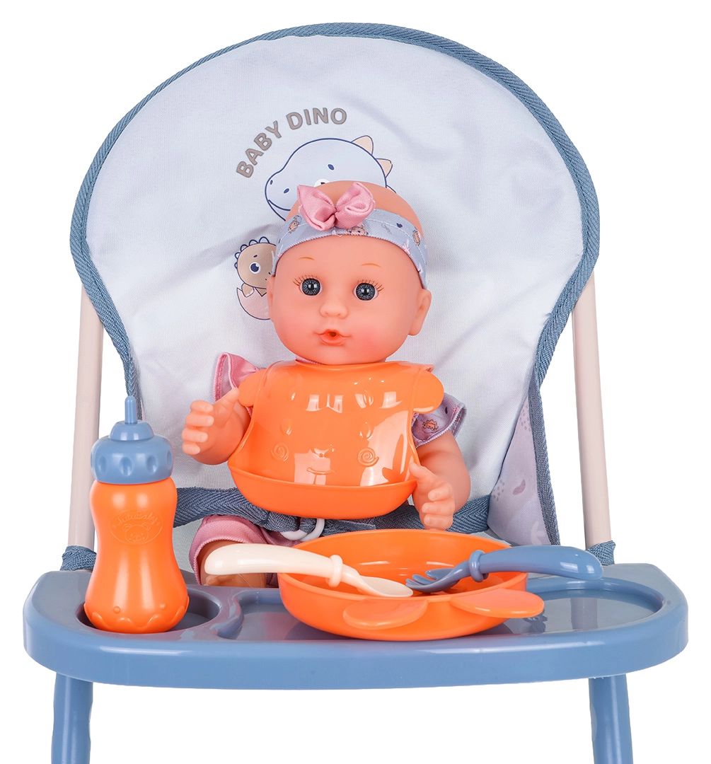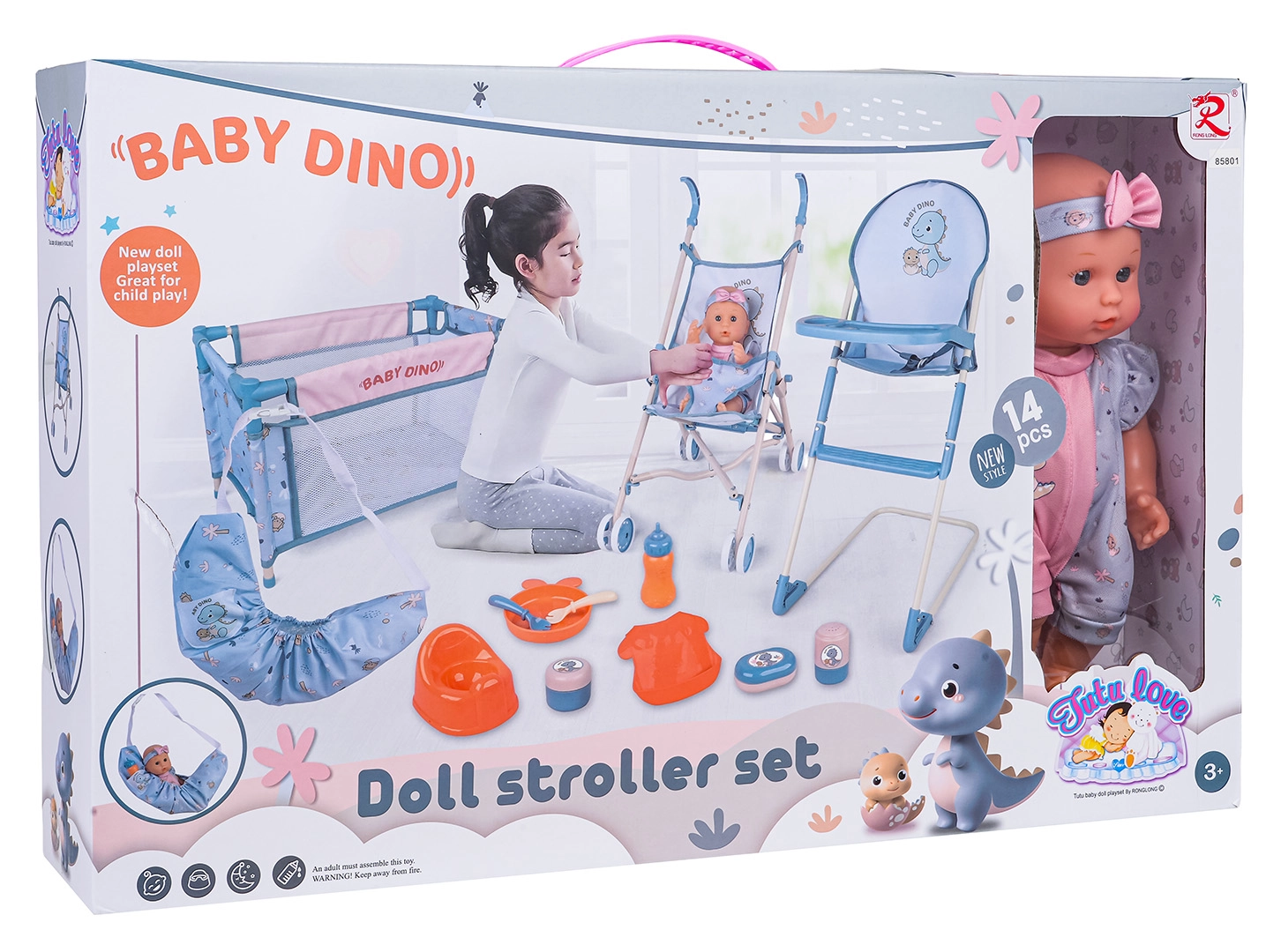 Dieses Mega-Set BABY DINO bietet Kindern viele Möglichkeiten für kreatives und realistisches Pflege-Spiel. Die Puppe hat bewegliche Arme und Beine, trägt einen farbenfrohen Strampler mit Haarband, kann aus dem Fläschchen trinken und „Pipi“ ins Töpfchen machen. Dank des leichten Kinderwagens, Reisebetts und Hochstuhls können Kinder die Puppe füttern, spazieren fahren und in den Schlaf wiegen.
