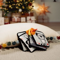 Entdecken Sie das ideale erste Spielzeug für Babys ab 0 Monaten. Das Set aus 4 doppelseitigen Stoffkarten (12 × 12 cm) mit hohem Kontrast hilft dem Kind, den Blick zu fokussieren, und fördert die Hand-Auge-Koordination. Jede Karte ist weich, knisternd und angenehm anzufassen – perfekt auch für die Allerkleinsten.