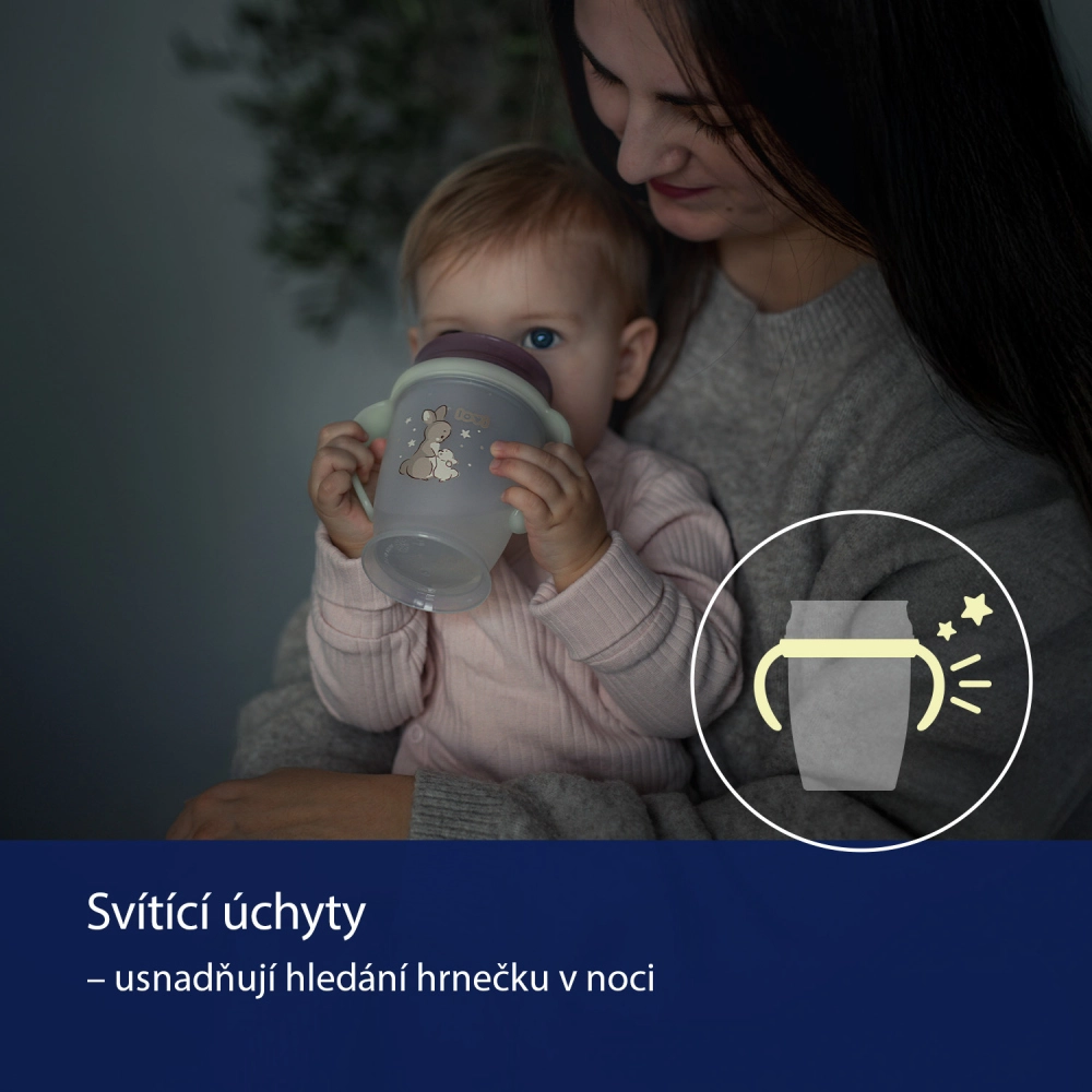 Ergonomische Griffe leuchten im Dunkeln und liegen perfekt in kleinen Kinderhänden – so finden Kind und Eltern den Becher jederzeit leicht.