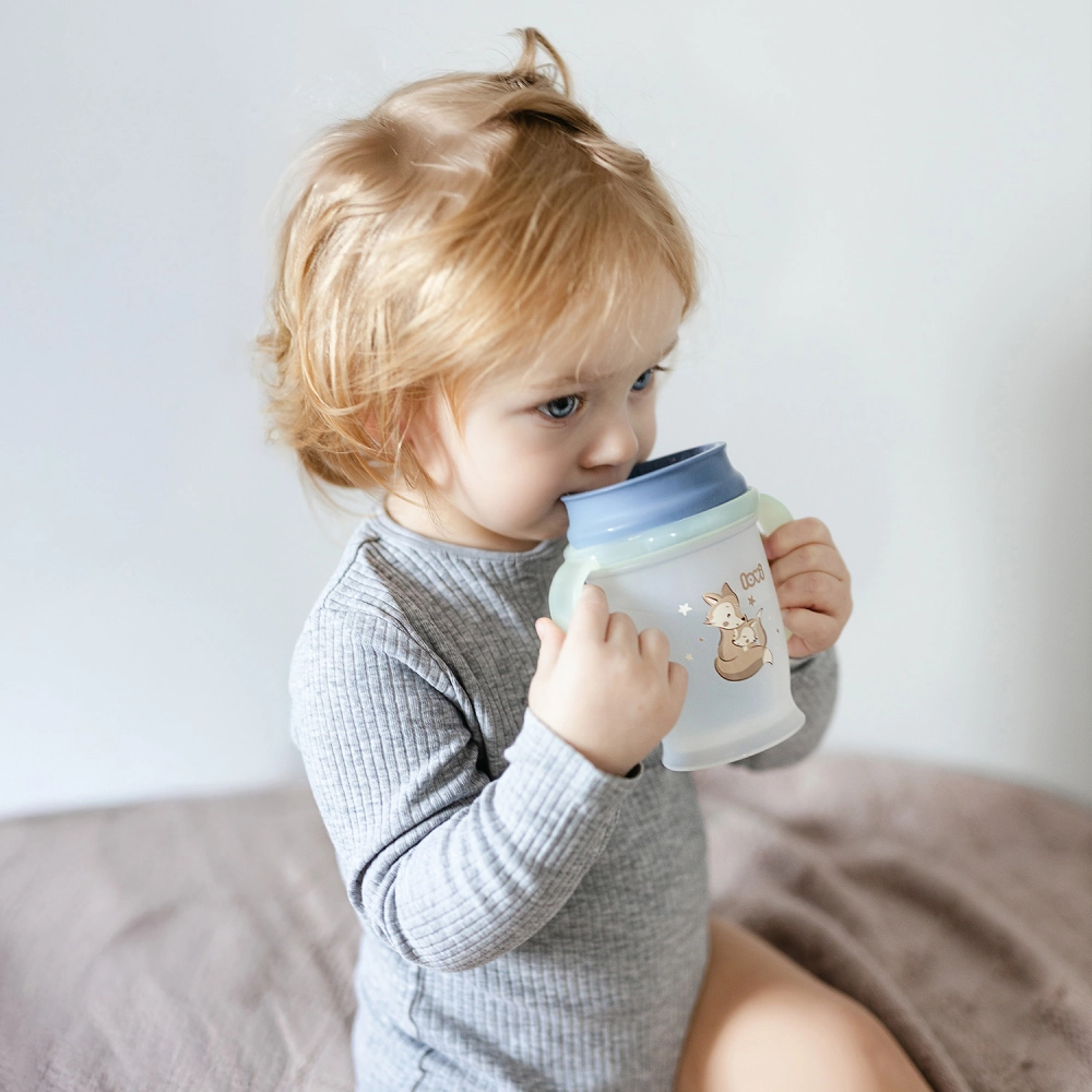 Das Kind kann an jeder Stelle des Randes trinken – ähnlich wie aus einem offenen Glas, jedoch mit minimalem Verschütten. Ideal zum Üben des selbstständigen Trinkens.