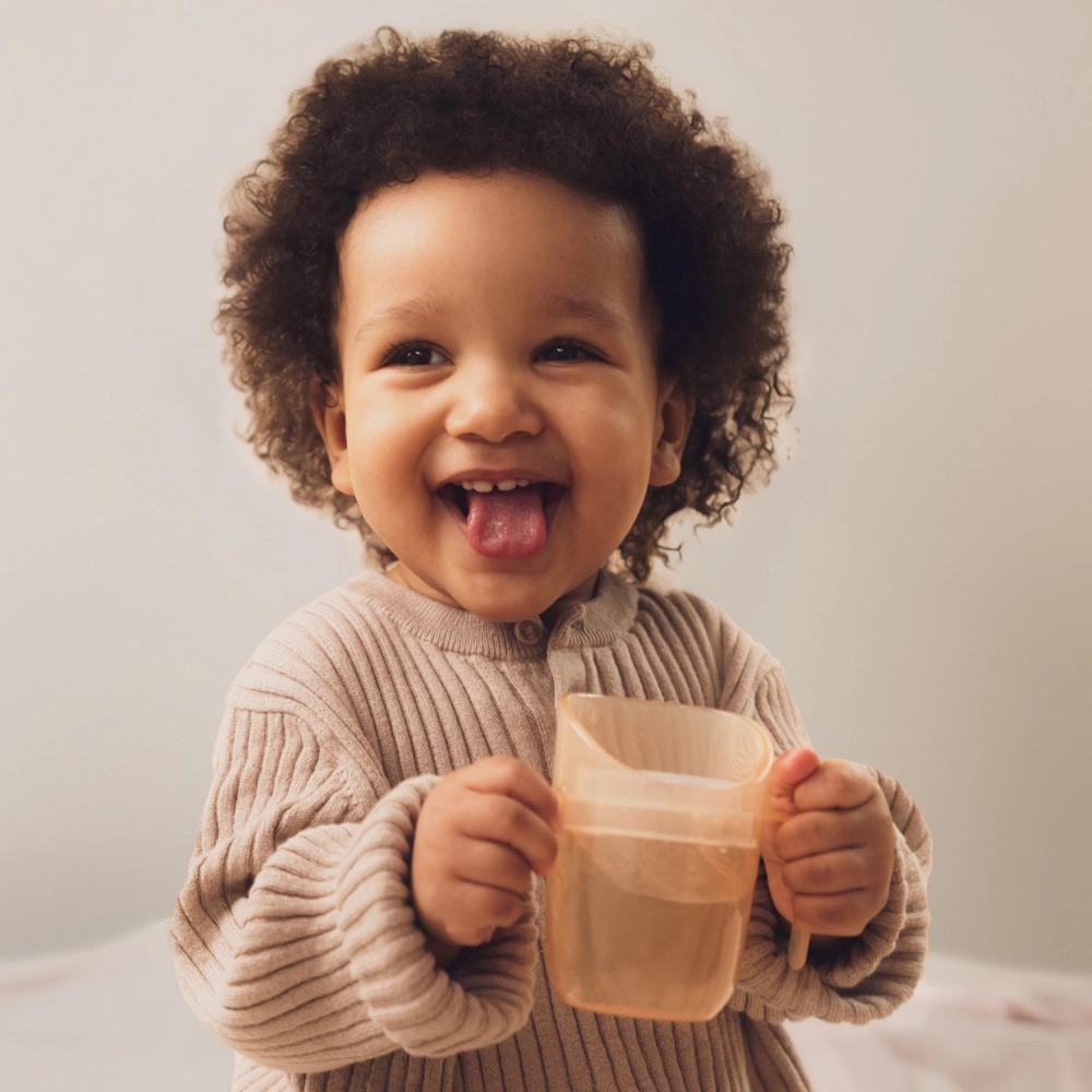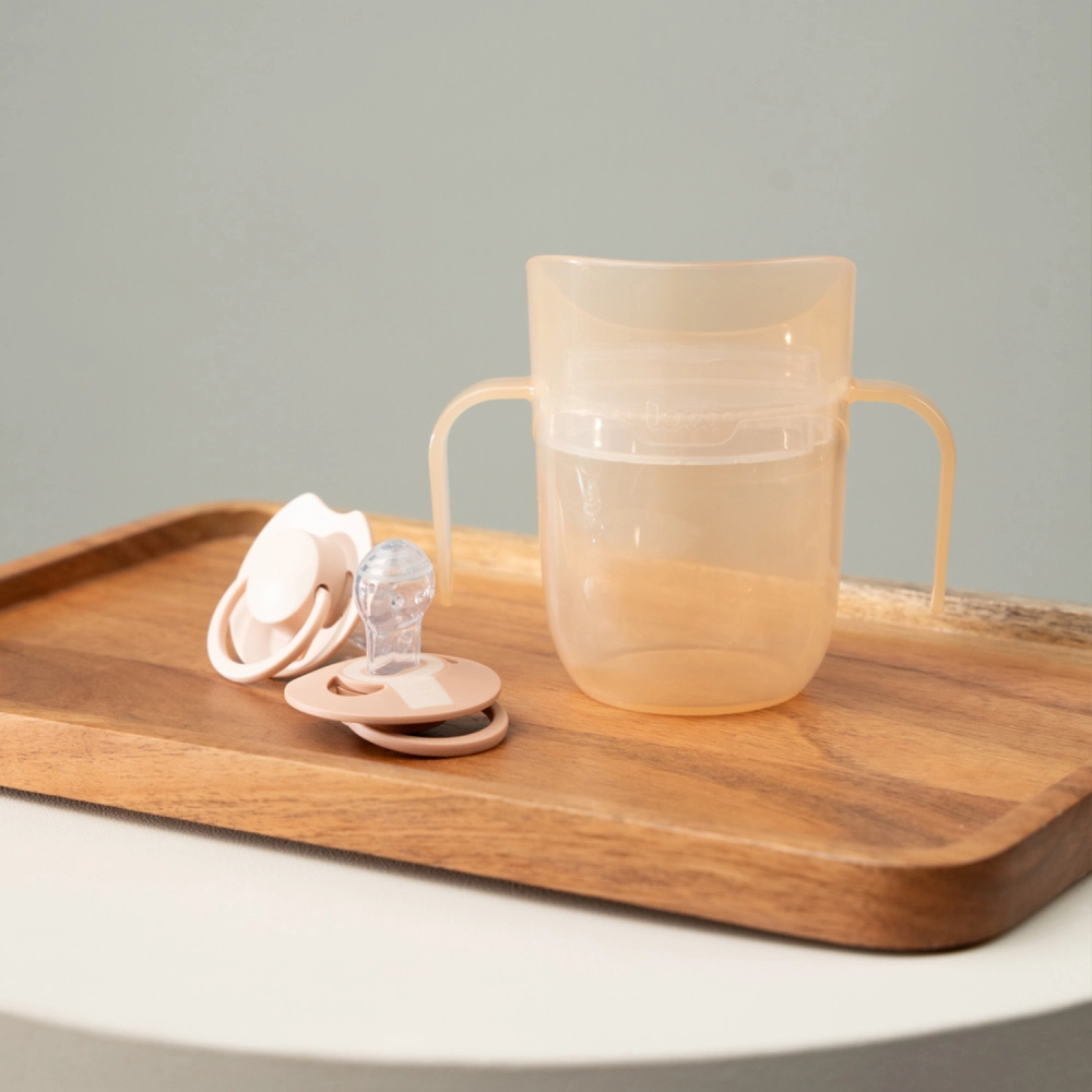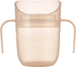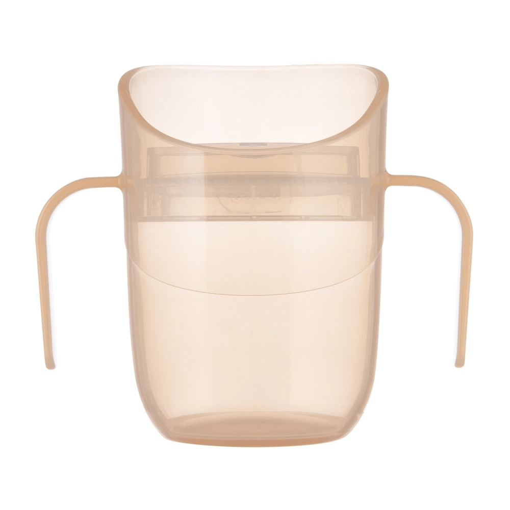 Die leichte Konstruktion, profilierte Doppelgriffe und das kleinere Anfangsvolumen (ca. 130 ml mit Einsatz) erleichtern den Übergang von der Flasche. Sobald das Kind bereit ist, nehmen Sie den Einsatz einfach heraus und erhalten einen offenen Becher mit 150 ml – ein Produkt, das wirklich mit dem Kind mitwächst.