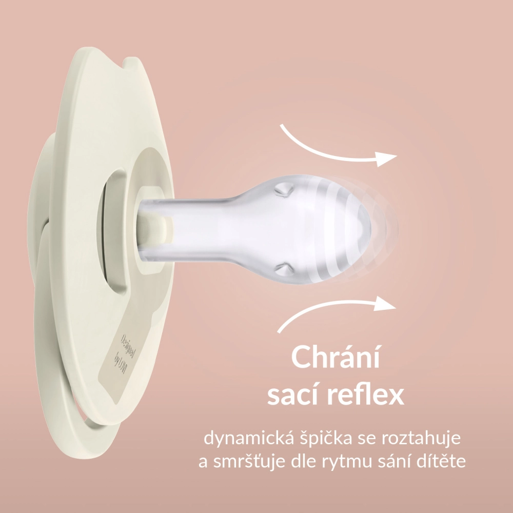Der Sauger aus unterschiedlich starkem Silikon dehnt sich beim Saugen natürlich aus und zieht sich zusammen, unterstützt das Stillen und beeinträchtigt die Sprach- und Bissentwicklung nicht*.