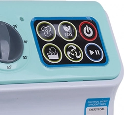 Kinder lieben das Bedienfeld mit Tasten, den Drehregler für die Temperatur und die Start-/Stop-Funktion. Die Bedienung ist intuitiv und erinnert an eine echte Waschmaschine.