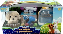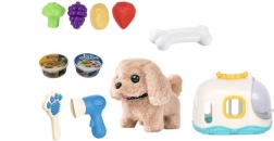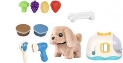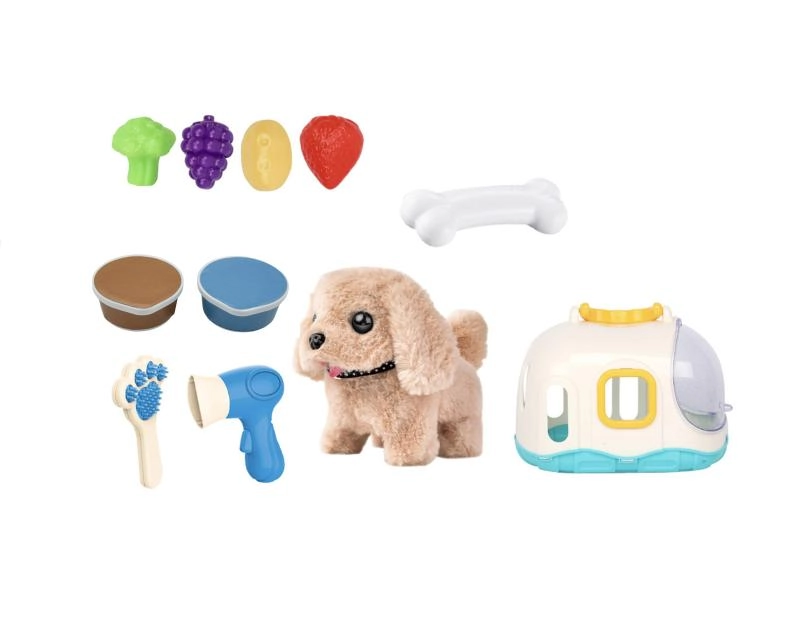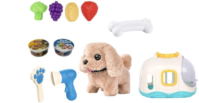 Das praktische Häuschen dient als gemütliches Zuhause und als tragbarer Koffer, sodass Kinder den Hund überallhin mitnehmen können. Im Set finden sie außerdem Pflegezubehör – Kamm und Föhn – sowie Leckereien aus Kunststoff in Form von Obst und Gemüse zum Füttern-Spielen.