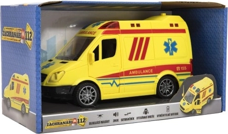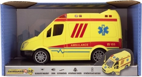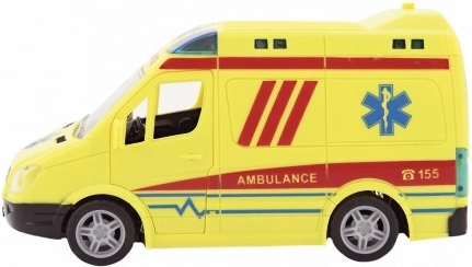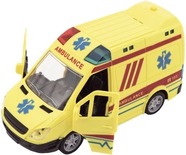 Der Krankenwagen ist mit Licht- und Soundeffekten ausgestattet, die das Spiel noch realitätsnäher machen. Dieses Modell basiert auf einem Schwungradantrieb, der dafür sorgt, dass es sich problemlos auf ebenen Flächen bewegt.