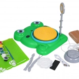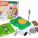Froschförmige Basis, Drehteller, Fußpedal, Lampe, Werkzeuge, Farben und 2× Ton – alles für sofortiges Formen und Bemalen.