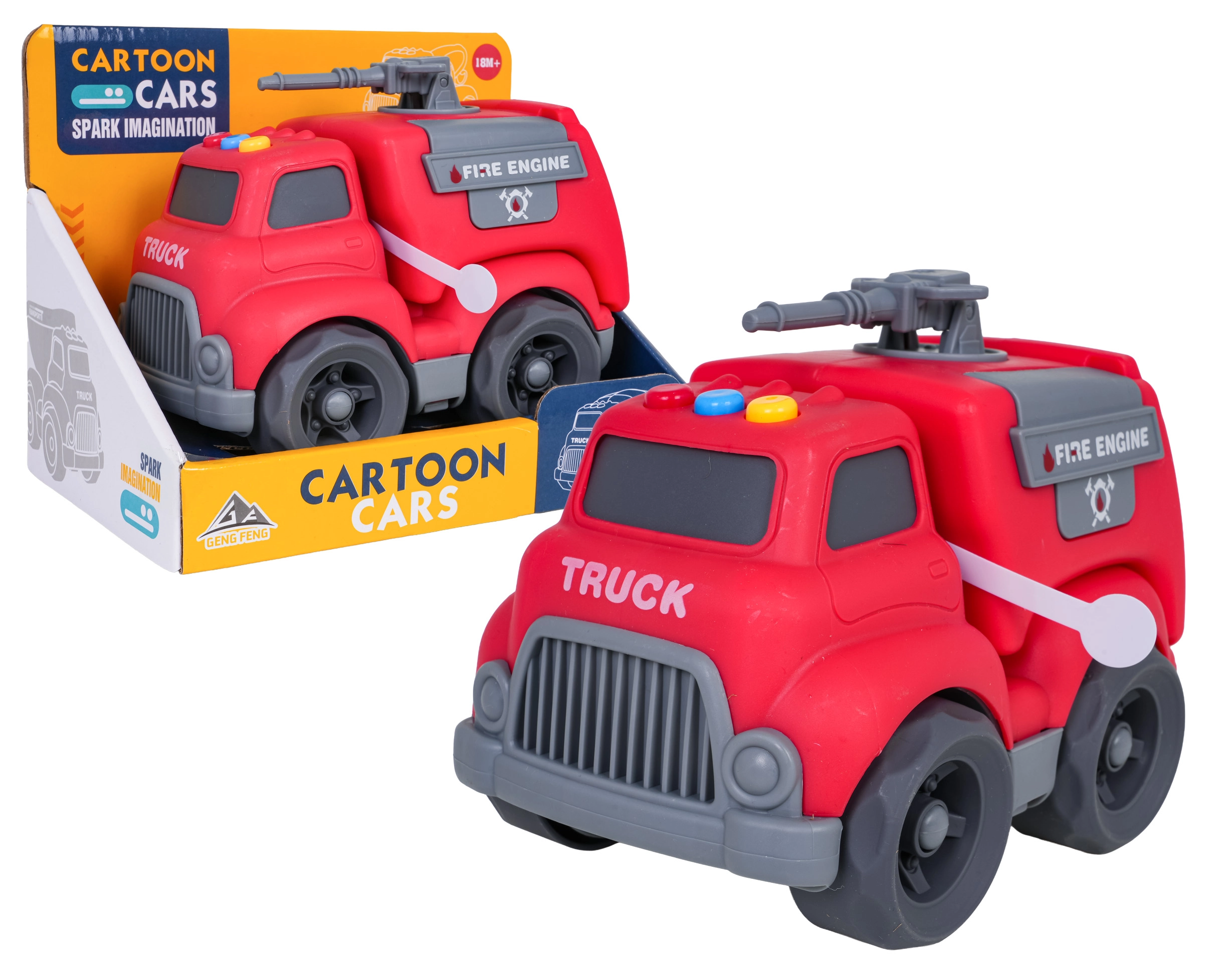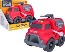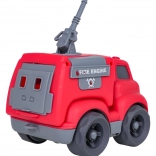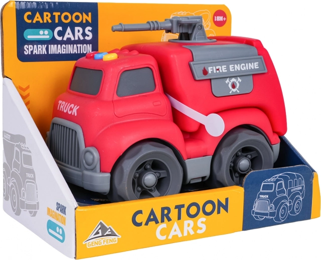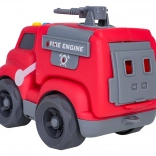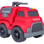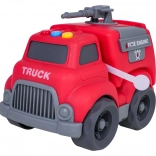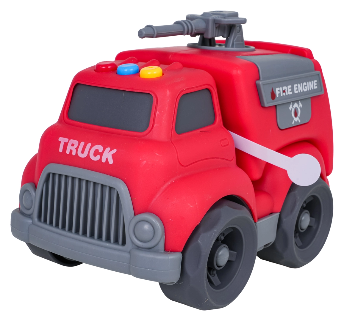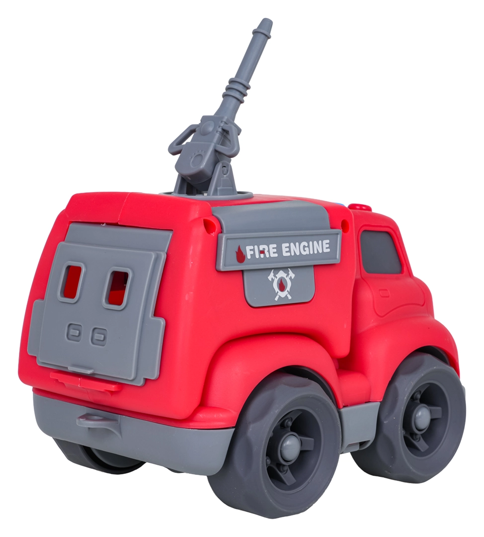 Auf dem Dach des Autos befinden sich leicht zugängliche Tasten für Start-, Fahr- und Rückfahrgeräusche sowie eine fröhliche Melodie. Kinder begeistert außerdem das dreh- bzw. ausziehbare Löschrohr und die öffnende Heckklappe. Das Spielzeug ist sofort einsatzbereit – 4× LR44-Batterien sind im Lieferumfang enthalten.