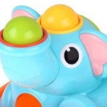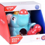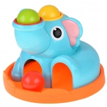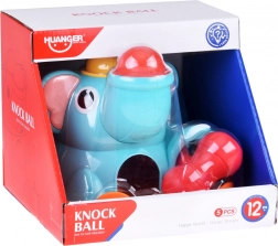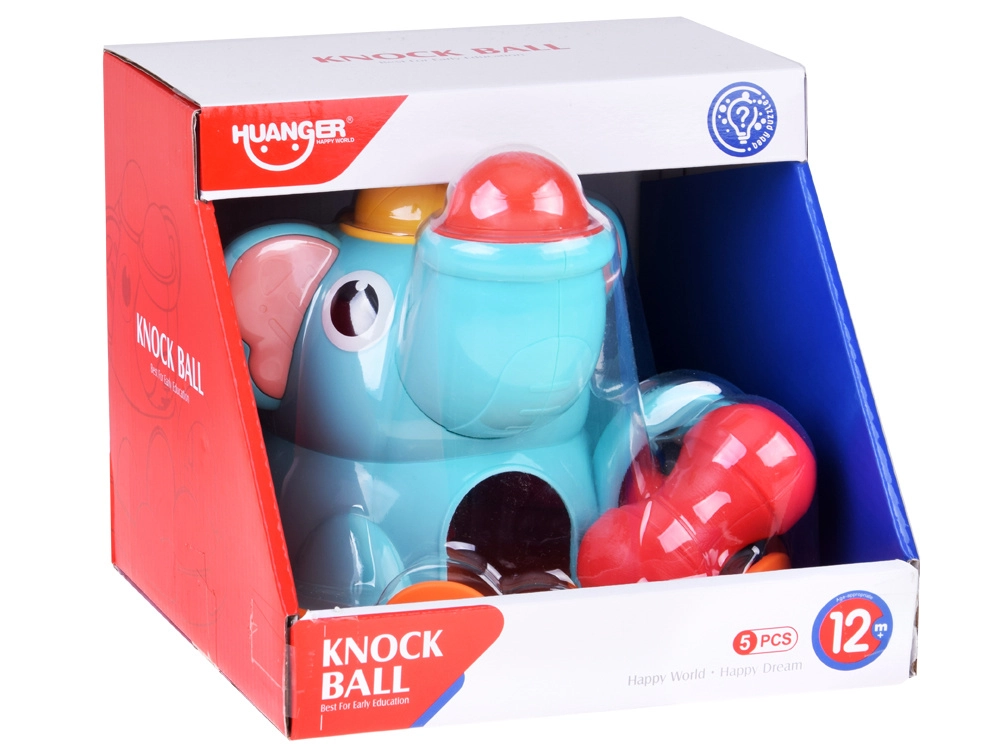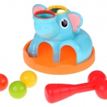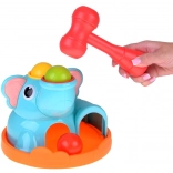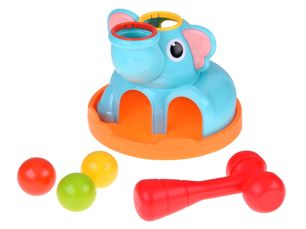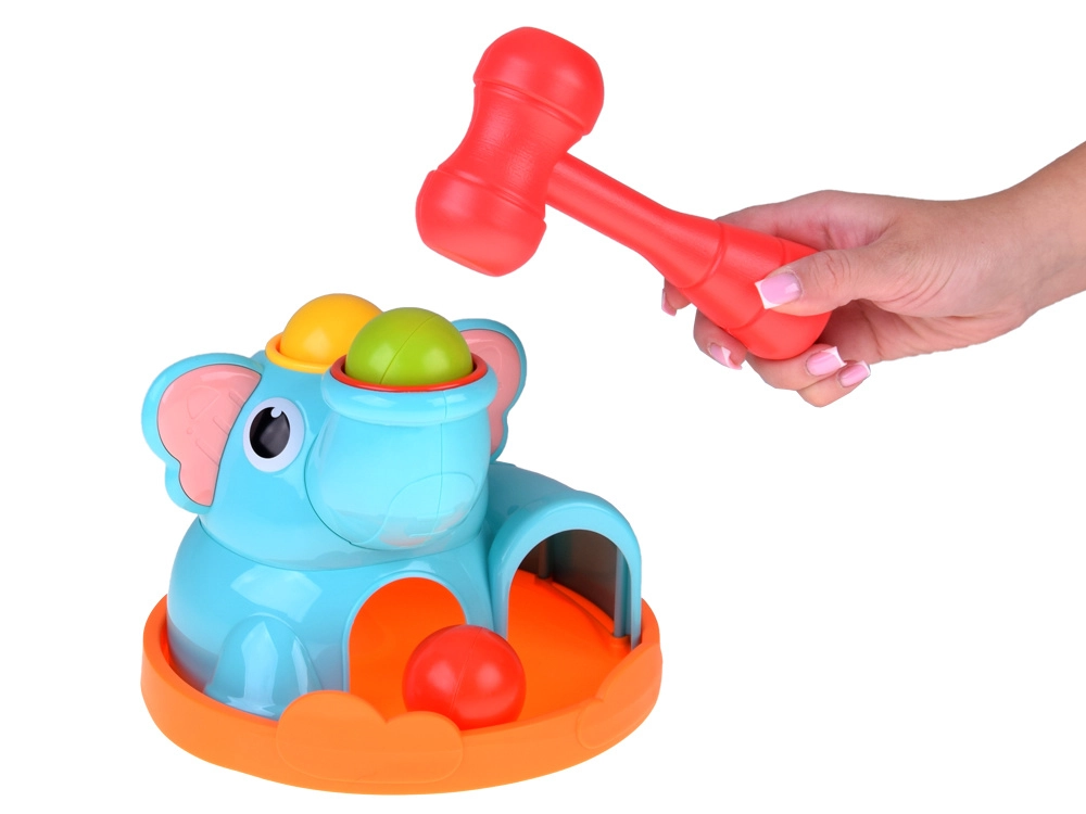 Der niedliche Elefant auf einer stabilen Basis begeistert Kinder mit seinen leuchtenden Farben und abgerundeten Formen. Enthalten sind ein roter Hammer und drei bunte Kugeln (rot, gelb, grün), die in die Öffnungen gelegt und hineingeklopft werden – die Kugeln rollen anschließend durch das Spielzeug und kommen wieder heraus, was zu weiteren Versuchen motiviert und das Verständnis von Ursache–Wirkung unterstützt.