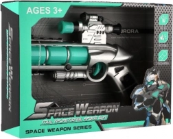 Das Design der Pistole erinnert an Waffen der Zukunft durch stilvolle türkisfarbene und graue Töne.