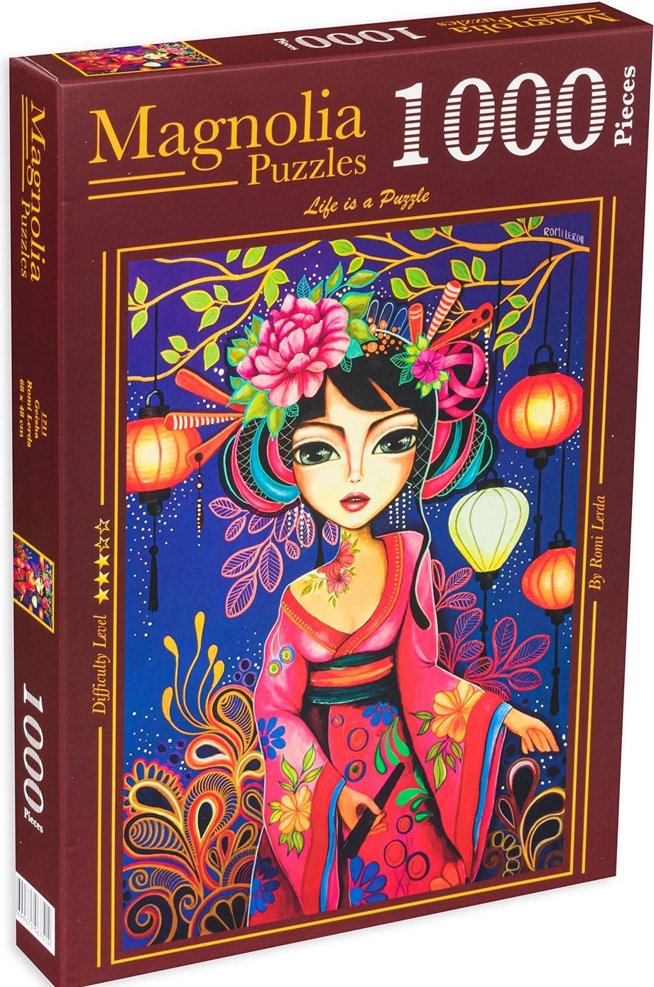 Entdecken Sie den Zauber traditioneller japanischer Ästhetik mit einem Geisha-Motiv. Dank 1000 präzise gestanzter Teile bietet es die ideale Herausforderung für Einsteiger und fortgeschrittene Puzzle-Liebhaber. Das fertige Bild mit den Maßen ca. 48 × 68 cm kommt an der Wand wie auch im Regal hervorragend zur Geltung.