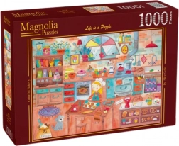 Entdecken Sie den Zauber der Illustration einer bunten Bäckerei und gönnen Sie sich Stunden der Entspannung und Konzentration. Dieses Bild voller köstlicher Details und leuchtender Farben macht das Puzzeln zu einem angenehmen Erlebnis und dient nach der Fertigstellung zugleich als schöne Dekoration.