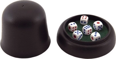 • Praktische Verpackung – der Becher sorgt für bequemes Mischen und Würfeln.