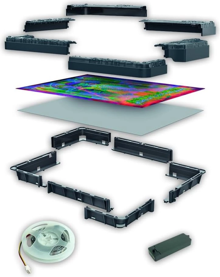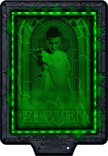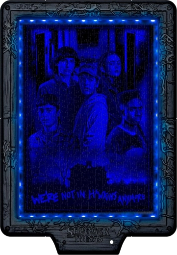 Dieses einzigartige Puzzle bringt die filmische Stimmung der Serie STRANGER THINGS in dein Zuhause. Dank des integrierten elektronischen Moduls und des RGB-LED-Streifens verwandelt sich das Bild beim Einschalten – jede LED-Farbe offenbart eine andere Ebene der Szene mit der Jagd auf den Demogorgon. Bei normaler Beleuchtung siehst du eine Komposition als Überlagerung von drei Farbebenen, in der Dunkelheit zeichnet jeder Farbton neue Details.