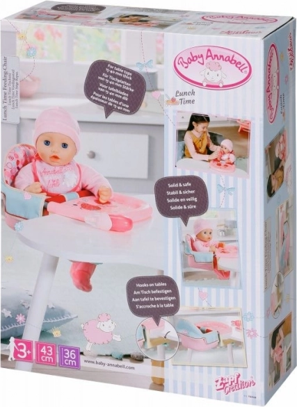 Der praktische Hänge-Hochstuhl für die Puppe Baby Annabell ermöglicht es, deine kleine Freundin immer mit an den Tisch zu nehmen. Er lässt sich leicht an Tischplatten mit einer Stärke von 15–40 mm befestigen, hat eine weiche Polsterung, ein abnehmbares Tischchen und ist dank der klappbaren Konstruktion ideal auch für unterwegs. Perfekt zum Füttern, Spielen und Malen und zur Förderung der kindlichen Fantasie.