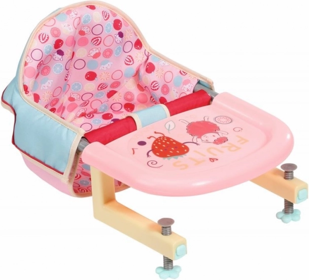 Schenke der Baby Annabell Puppe einen bequemen Platz am Tisch. Der farbenfrohe Hochstuhl mit niedlichen Obst- und Essensmotiven wird mithilfe von Schraubklemmen fest am Tisch befestigt und ist beim Spielen und Füttern stabil und sicher. Die weiche Polsterung sorgt für Komfort, während das abnehmbare Tischchen Platz zum Spielen, Malen und Basteln bietet.