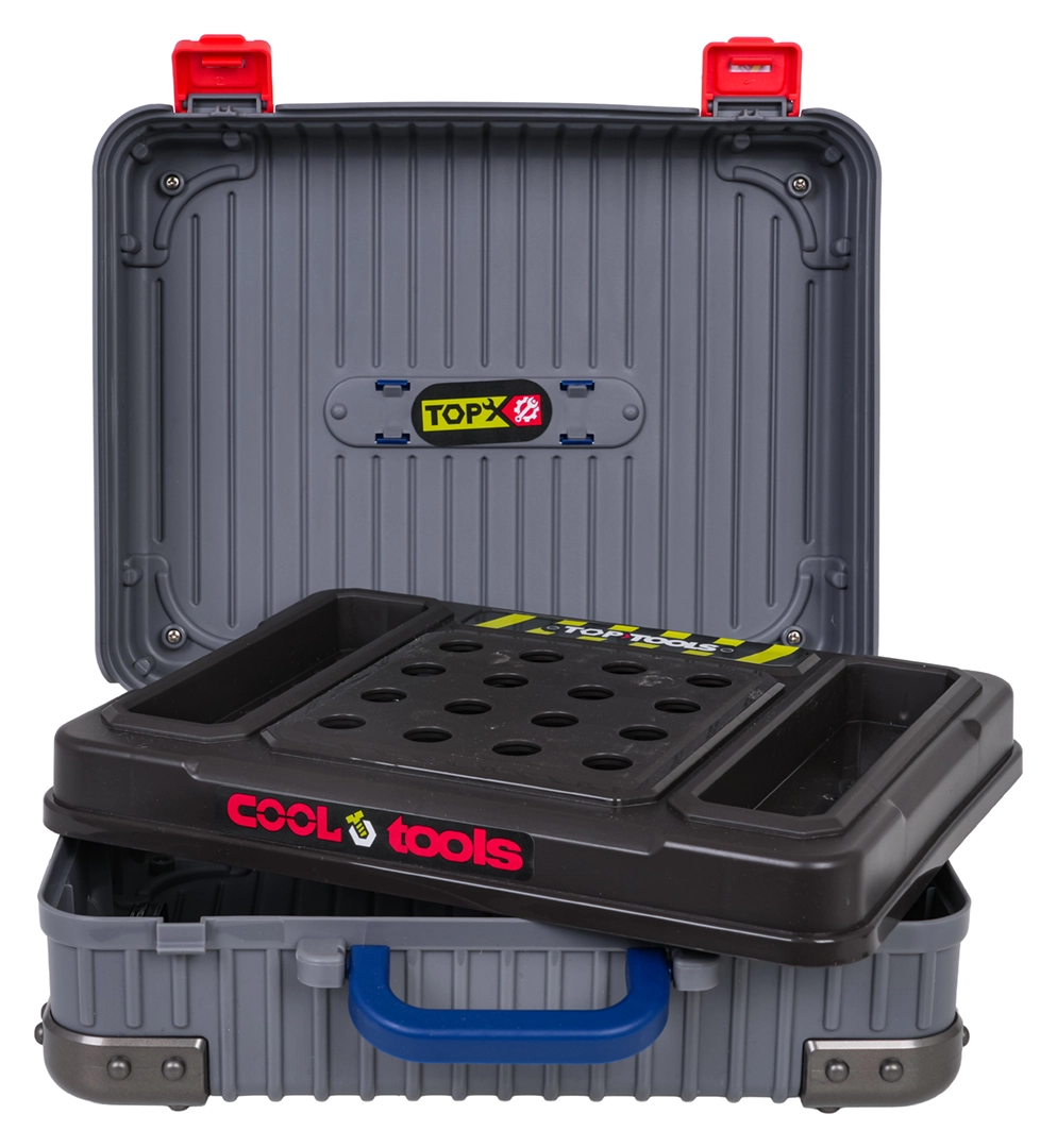 Herausnehmbare Fächer und ein Organizer halten alle Schrauben, Muttern und Aufsätze an ihrem Platz. Schnelles Aufräumen und keine verlorenen Teile.