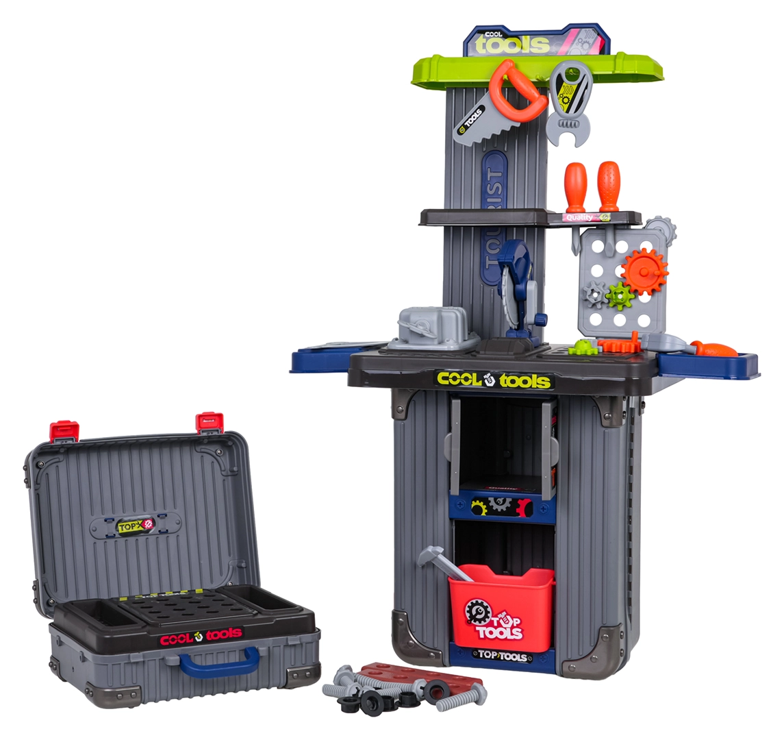 Dieses clevere 3-in-1-Set kombiniert zwei Koffer und ein umfangreiches Werkzeugsortiment zu einer mobilen Werkstatt. Kinder bauen mühelos ihre eigene Werkbank mit Schraubstock, Ablagen und Lochwand und räumen nach dem Spielen alles wieder in die mobilen Koffer. Hochwertiger Kunststoff hält intensiver Nutzung stand und sorgt für lange Lebensdauer.