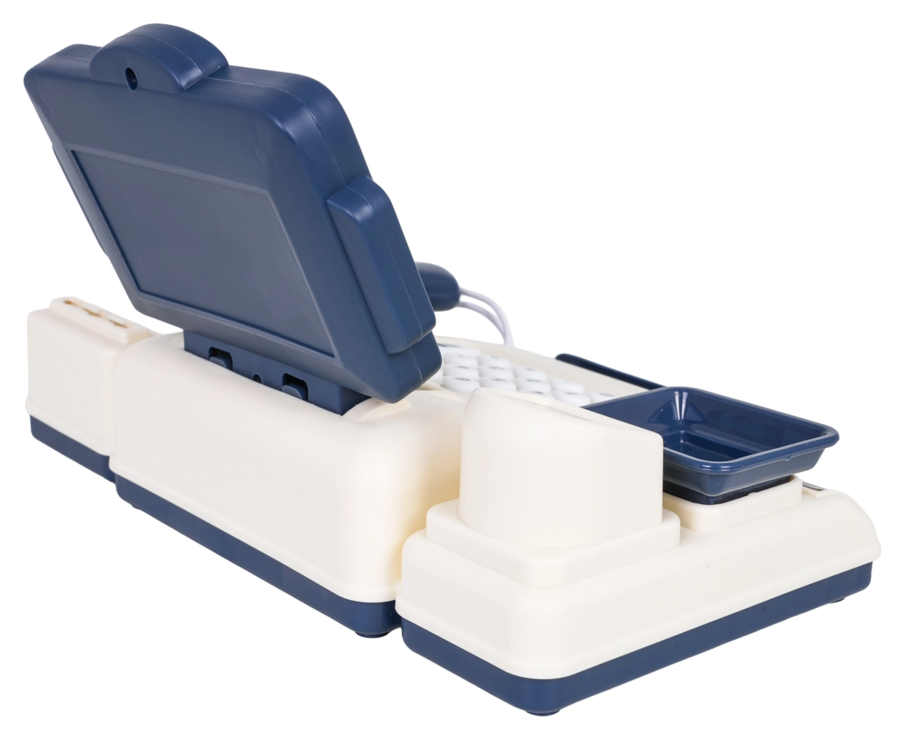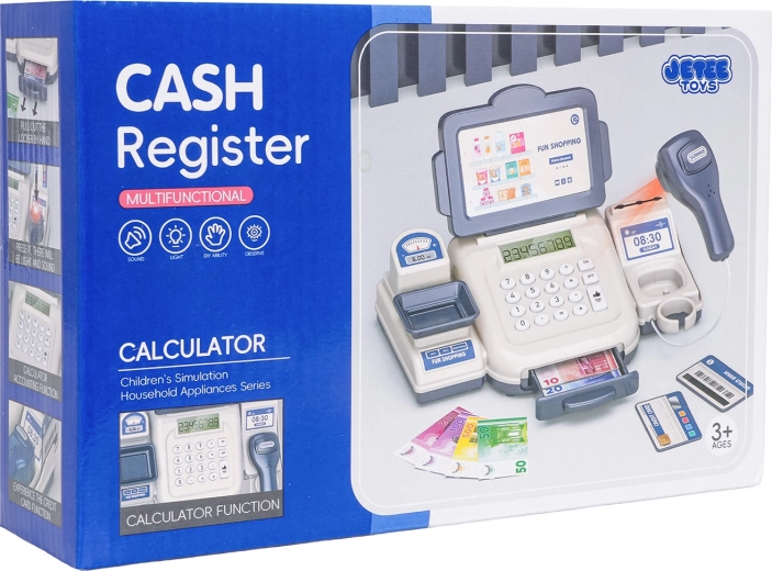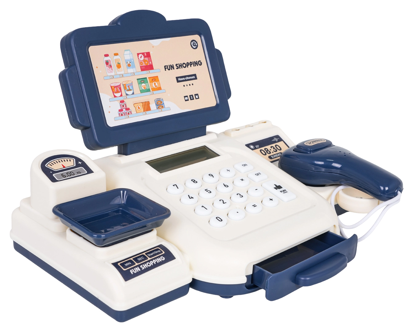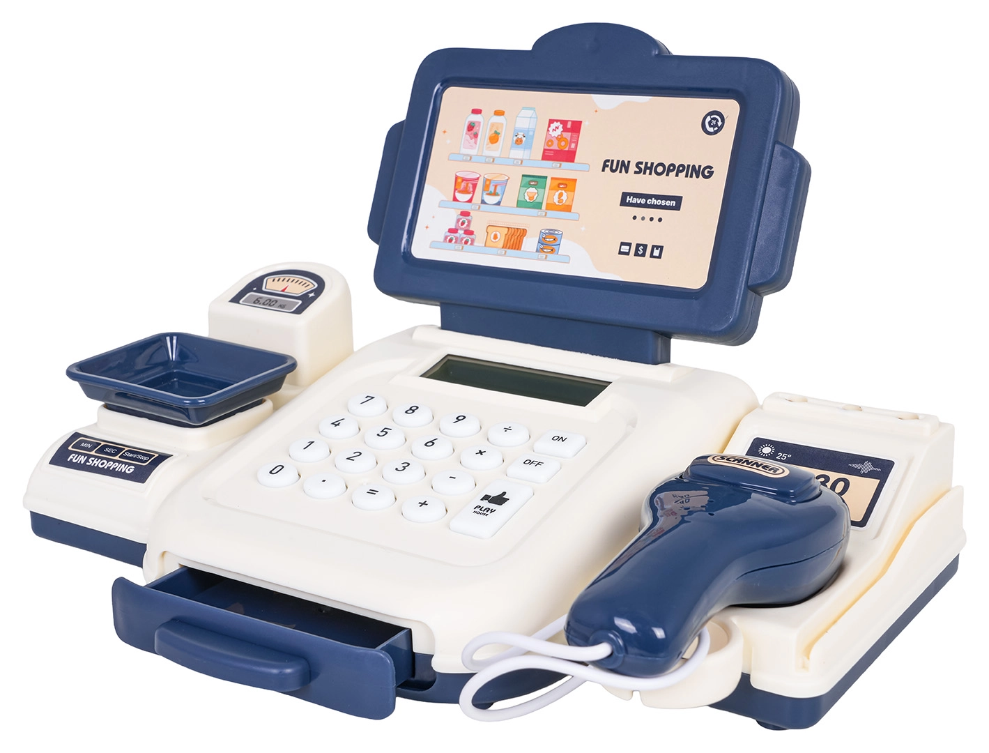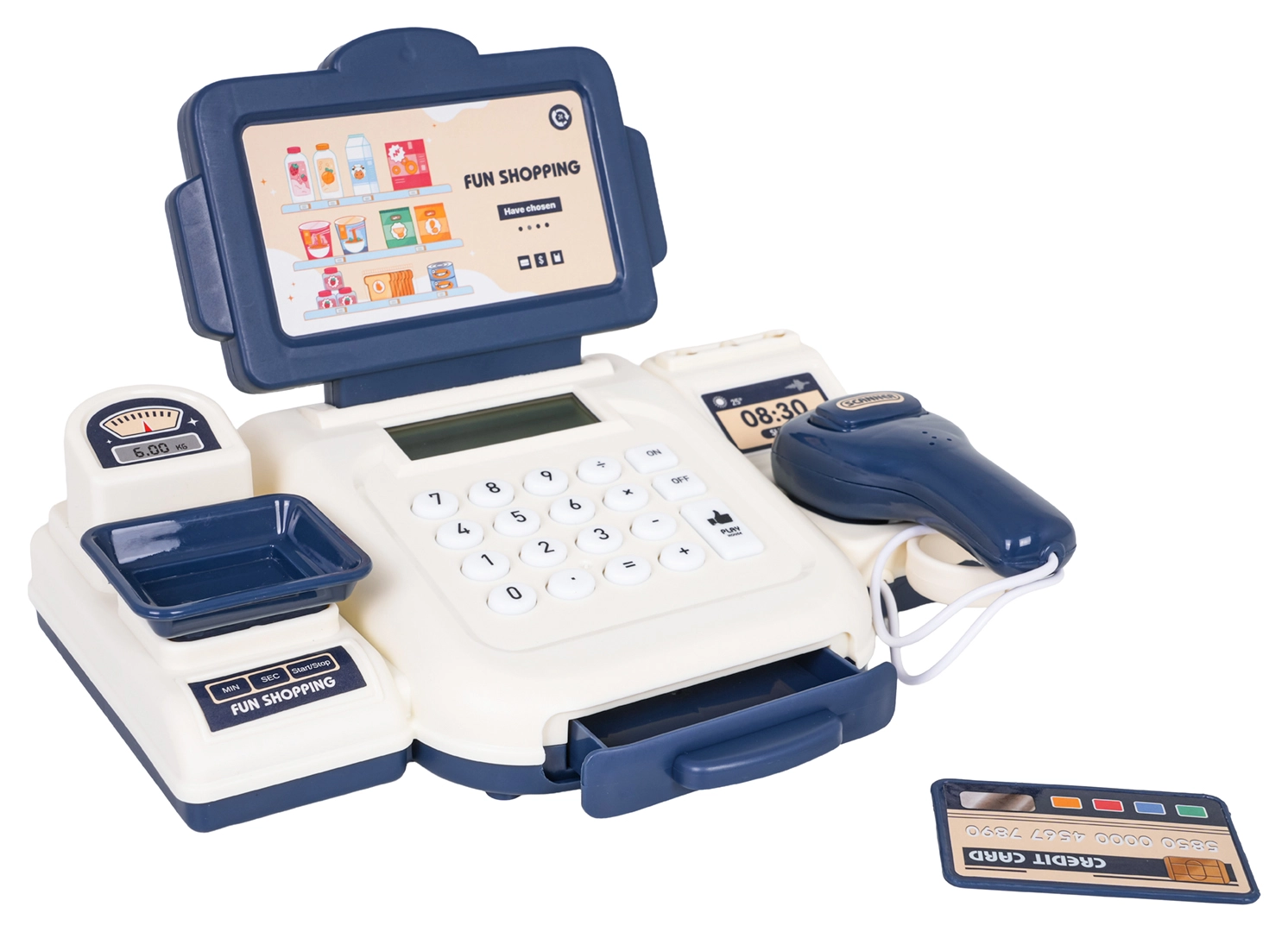 Laden spielen war noch nie so unterhaltsam! Diese Kinderkasse in Blau-Creme bietet eine funktionierende Rechenmaschine, einen Scanner mit Licht und Sound, eine Waage und eine öffnende Geldschublade. Im Set sind außerdem eine Zahlungskarte und Papiergeldscheine enthalten, sodass kleine Verkäufer Preise berechnen und auch bargeldlose Zahlungen üben können.