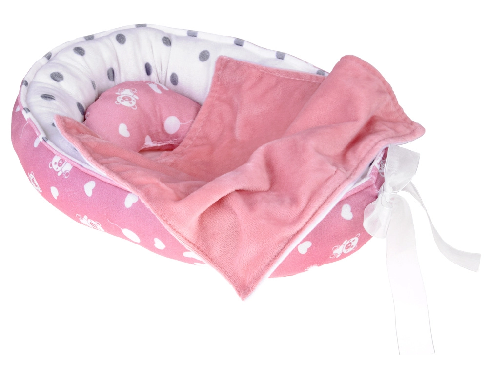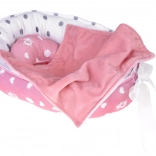 Die textile Wiege mit gepunktetem Futter und Schleife bietet der Puppe einen gemütlichen Rückzugsort. Kinder können sie leicht tragen und das Baby jederzeit und überall zum Schlafen legen.