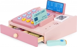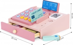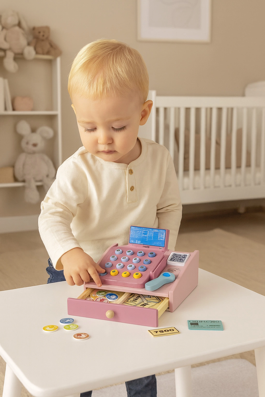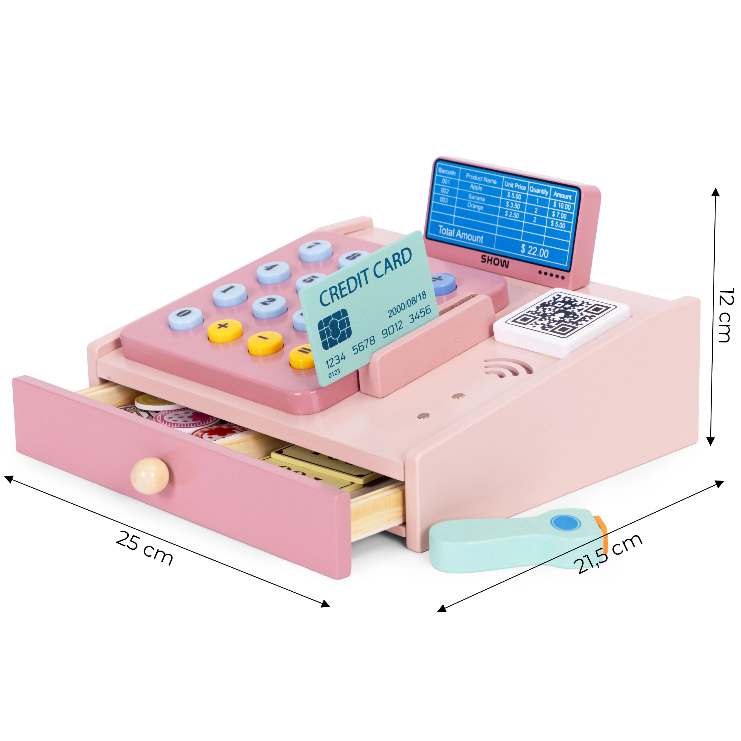 Diese hochwertige Holzkasse in zarten Pastellfarben ist die perfekte Ergänzung für Spielecke und Kinderzimmer. Realistische Elemente wie Handscanner, Kartenterminal, Tastatur mit Tasten und ausziehbare Schublade machen das Kaufladen‑Spiel unterhaltsam und lehrreich. Kinder trainieren Grundrechenarten, logisches Denken und Kommunikation.