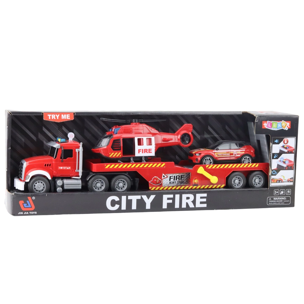Dieses detailreiche Set bietet Kindern actionreiche Szenarien vom Abschleppen von Fahrzeugen bis zu Luftrettungseinsätzen. Die tragende Plattform am Anhänger ermöglicht ein bequemes Auf- und Abladen des Feuerwehrautos, während sich der Hubschrauber mit Rädern auch wie ein Bodenfahrzeug über den Boden bewegen kann. Für Atmosphäre sorgen per Knopf aktivierte Lichter und Sounds, die dem Spiel zusätzliche Authentizität verleihen.