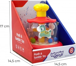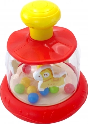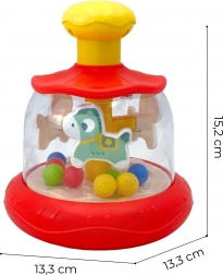 Dieses bunte, drehende Karussell mit Pferdchen und Kugeln begeistert jedes Baby. Einfach die gelbe obere Taste drücken und das innere Karussell beginnt sich zu drehen – die Kugeln wirbeln herum und sorgen für eine fesselnde Show sowie ein sanftes Rasseln. Das Spielzeug vereint Spaß und Sinnesförderung in einem.
