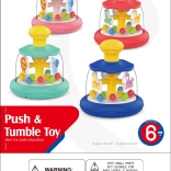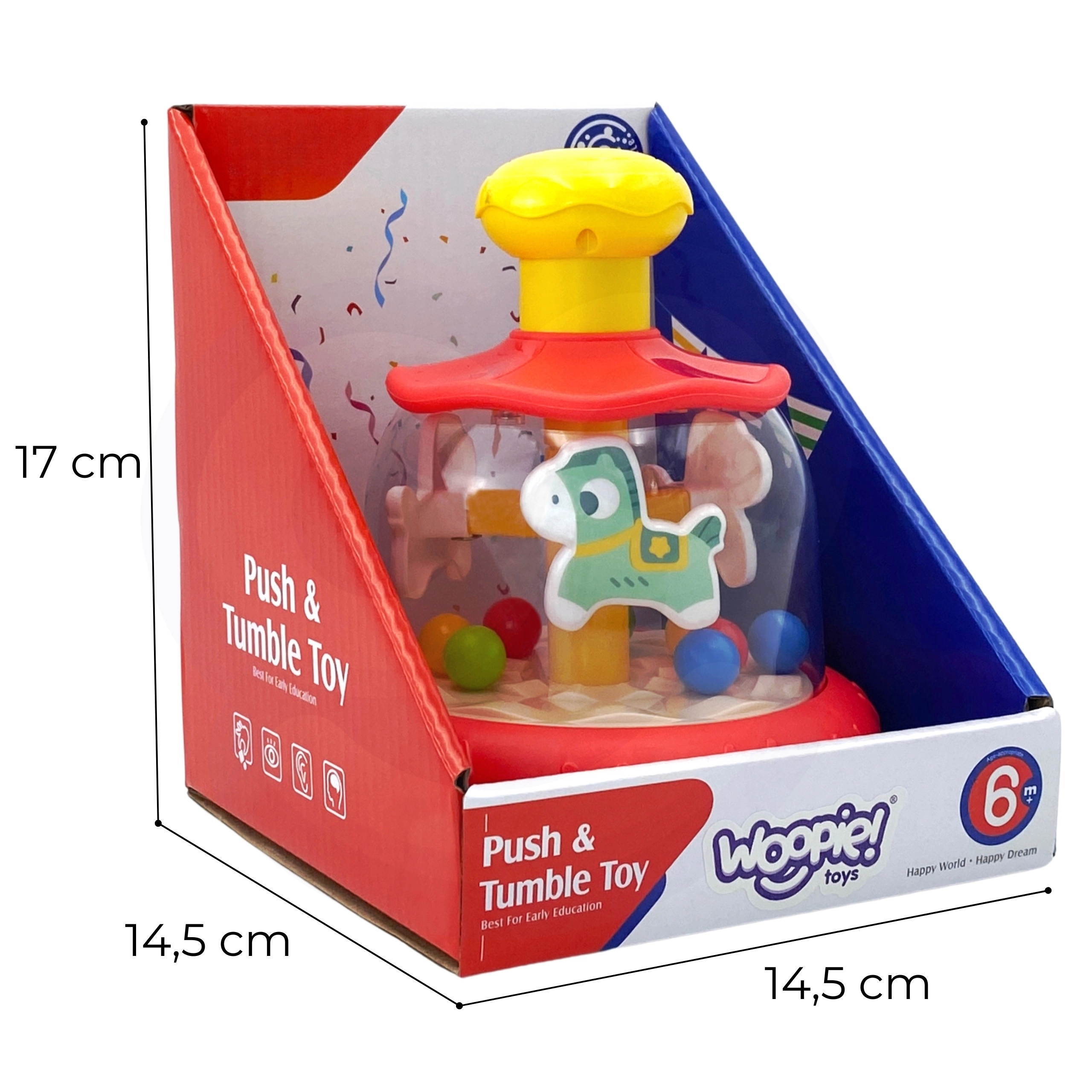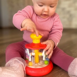 Dank der robusten Kunststoffkonstruktion, glatten Kanten und der ergonomischen Taste ist das Karussell für kleine Kinderhände sicher und leicht zu bedienen. Leuchtende Farben ziehen die Aufmerksamkeit auf sich und motivieren Kinder zum wiederholten Drücken – so trainieren sie ganz natürlich ihre Feinmotorik und Koordination.
