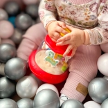 Kontrastreiche Farben und sich bewegende Kugeln unter der transparenten Kuppel bieten visuelle und akustische Reize zur Förderung der Sinne.