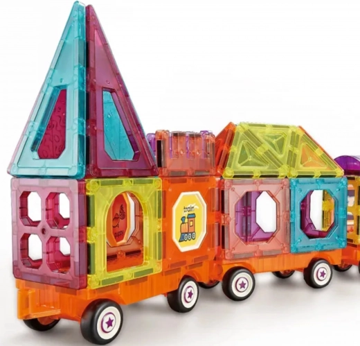 Entdecken Sie die kreative Welt des magnetischen Bauens. Bunte Teile in verschiedenen Formen und mit Aufdrucken haften schnell und sicher aneinander, sodass Kinder sofort Lokomotiven, Waggons und originelle Fahrzeuge bauen können. Das Set motiviert zu kreativem Spiel und entwickelt das konstruktive Denken.