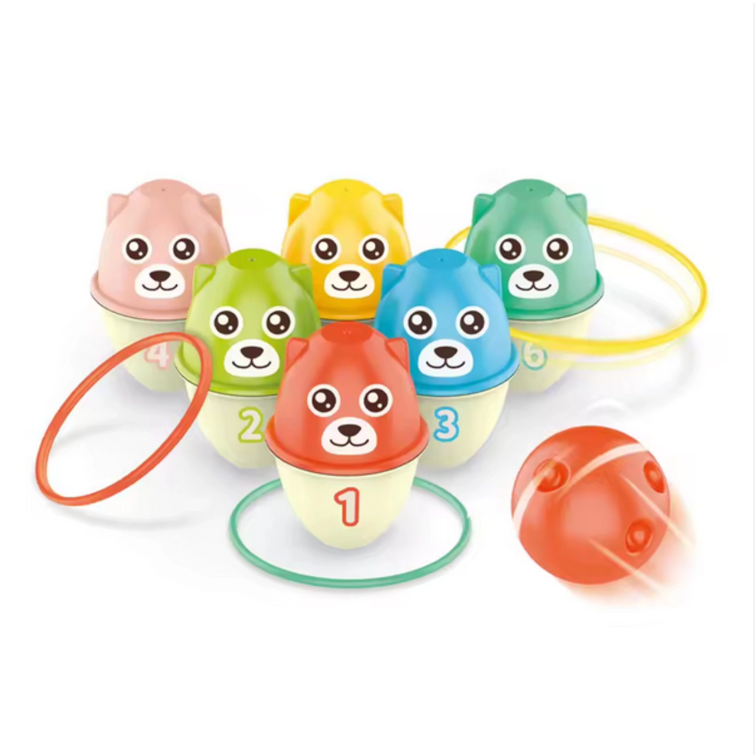 Das Woopie-Set mit bunten Bären bietet Kindern ab 18 Monaten eine großartige Kombination aus Bewegung und Lernen. Jeder Bär hat eine andere Farbe und Zahl, sodass Kinder ganz natürlich Farberkennung und Ziffern verinnerlichen. Dank verschiedener Spielmöglichkeiten – Kugel werfen, Ringe treffen oder einen Turm bauen, indem die Bären ineinander gesteckt werden – wird es den kleinen Spielerinnen und Spielern nicht langweilig und sie entwickeln gleichzeitig ihre Fähigkeiten weiter.