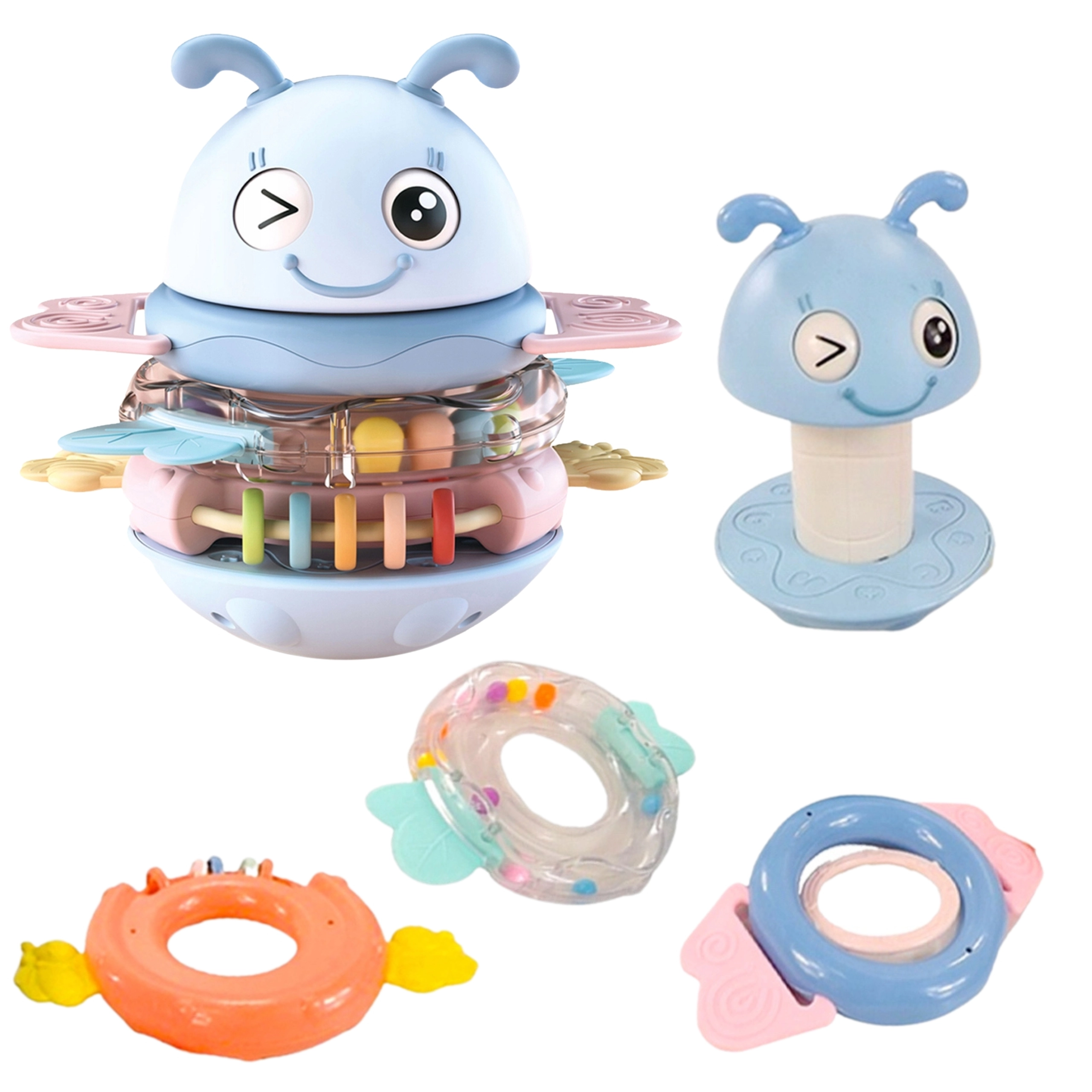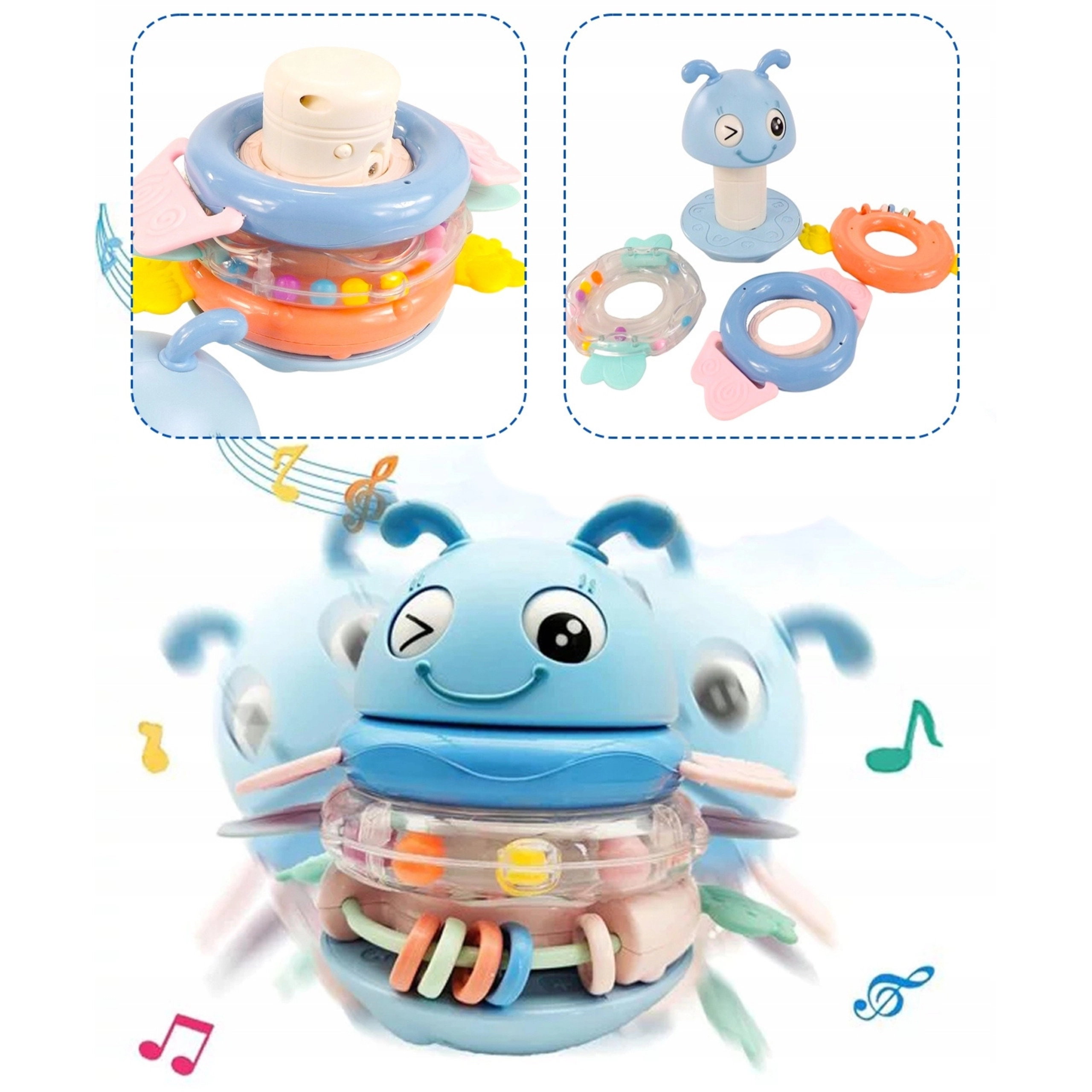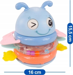 Diese niedliche „Libelle“ begeistert Babys durch Farben, Bewegung und Klänge. Die Ringe dienen als Rasseln und Beißringe und können einzeln verwendet oder auf den Stab mit 2 Klangmodi (Melodien und lustige Effekte) gesteckt werden. Dank der weichen Silikon-Noppen massieren sie sanft das Zahnfleisch beim Zahnen.