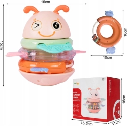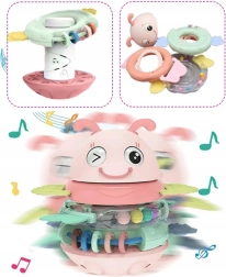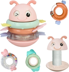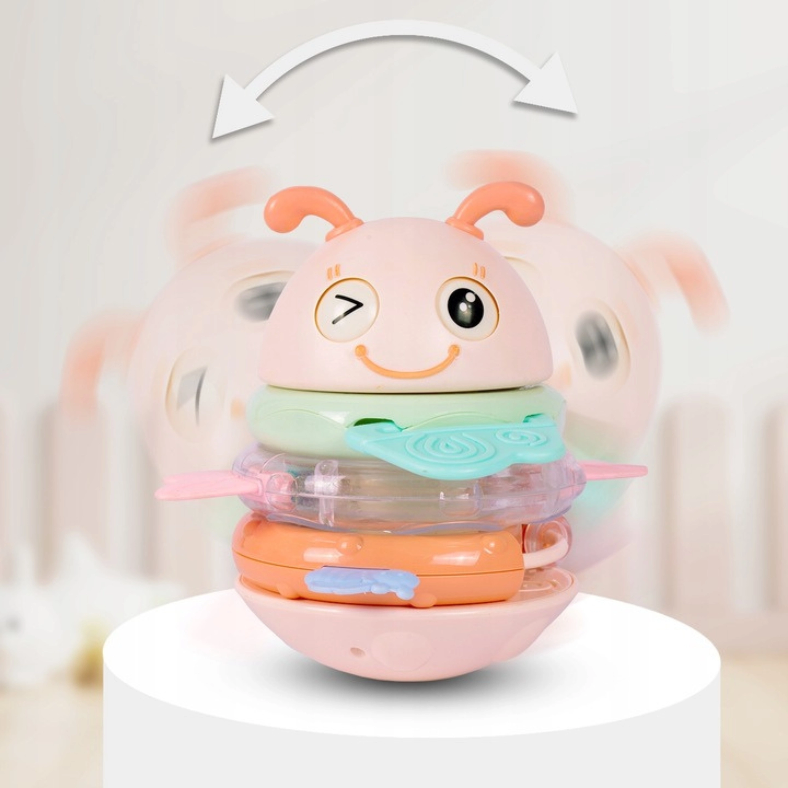 Suchen Sie ein Babyspielzeug, das fasziniert, das Zahnfleisch beruhigt und zugleich die Entwicklung fördert? Diese rosa Biene von WOOPIE ist ein multifunktionales sensorisches Spielzeug, geeignet ab den ersten Lebensmonaten. Die Ringe können einzeln als Beißringe und Rasseln verwendet oder auf den Stift aufgesetzt werden – das Spielzeug spielt dann ein Lied oder gibt ein lustiges Geräusch von sich. Die stabile, abgerundete Basis wiegt sich sanft und motiviert das Kind zum wiederholten Erkunden.