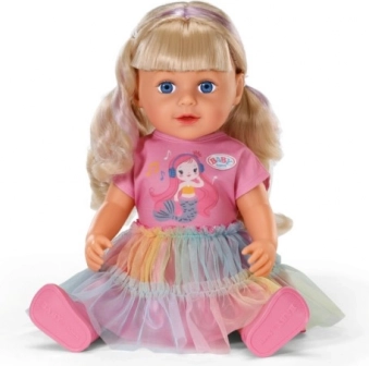 Carla trägt ein niedliches T-Shirt mit Print, einen regenbogenfarbenen Tüllrock und stylische Schuhe. Der feste Körper ist auch für Wasser geeignet, sodass der Badespaß in der Wanne nicht zu kurz kommt. Die hochwertige Verarbeitung und langlebige Materialien begeistern Kinder und Eltern gleichermaßen.