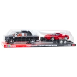 Schwarzer Pick-up mit Anhänger und rotem Sportflitzer bilden ein realistisches Set für thematisches Spiel.
