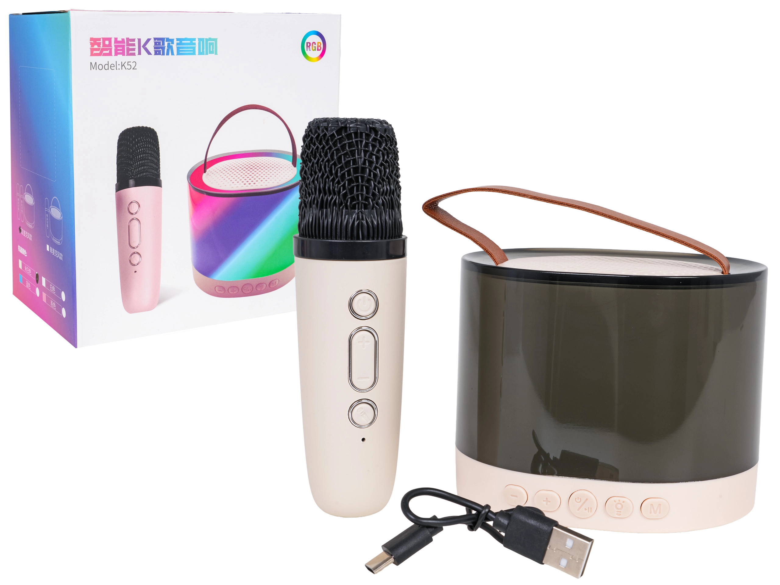 Dieses tragbare Karaoke‑Set kombiniert ein hochwertiges kabelloses Mikrofon mit einem stylischen Lautsprecher mit transparentem Gehäuse und Kunstleder‑Schlaufe für einfaches Tragen. Fortschrittliche MP3‑Dekodierung und DSP‑Rauschreduzierung sorgen für prägnante Bässe, klare Höhen und kräftigen, vollen Klang. Die RGB‑LED‑Beleuchtung bietet 5 Effekte, die sich mit der Musik synchronisieren – kurzer Druck wechselt die Modi, 2‑sekündiges Halten schaltet die Lichter aus.