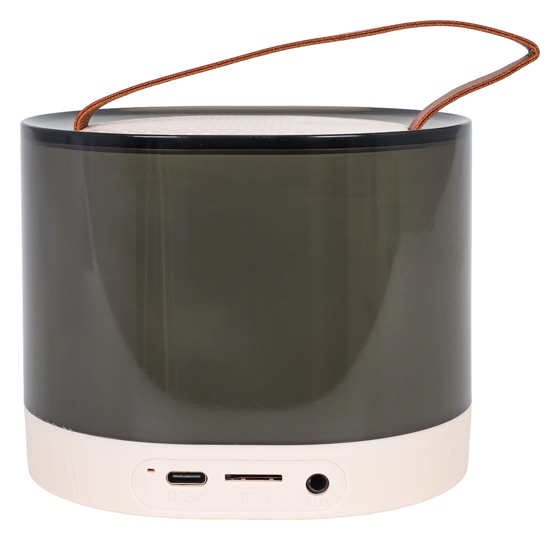 Bluetooth 5.0, Steckplatz für TF‑Karte (bis 64 GB), 3,5‑mm‑AUX und USB‑C‑Laden. Tasten für Power, Lautstärke, Modus und Licht jederzeit griffbereit.