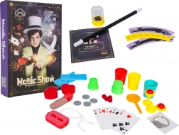 Anleitungen mit 74 Tricks und Codes zu Videos, 5× Karte, Zauberstab, Münzbox, 4× Münze, Becher für Tricks, Würfelbox, Zauberfinger mit Taschentuch, Zauberbecher mit Kugel, Zauberbecher-Set, Zauberherzen, Ring mit Kette, Schnürsenkel, weitere Zauberrequisiten