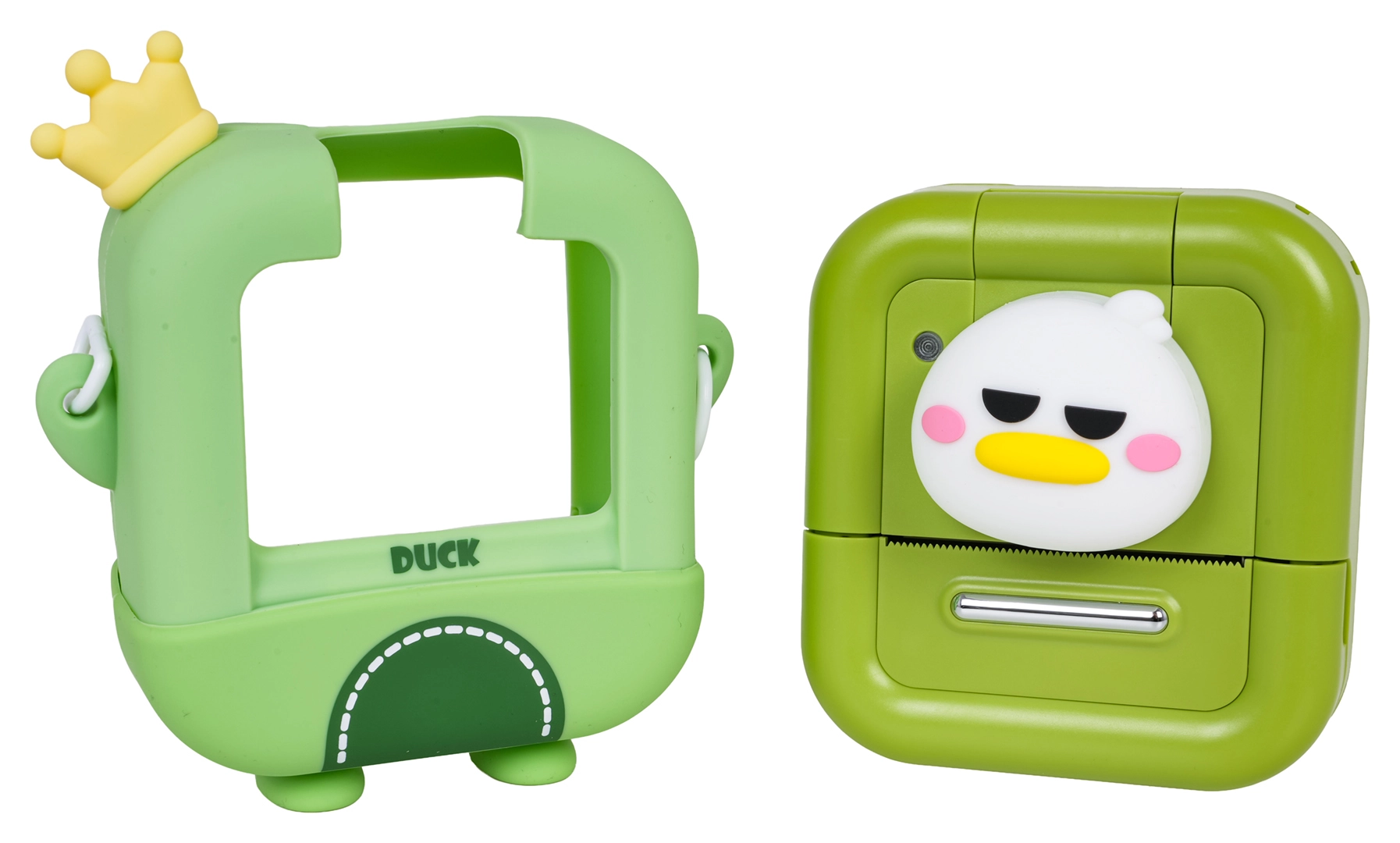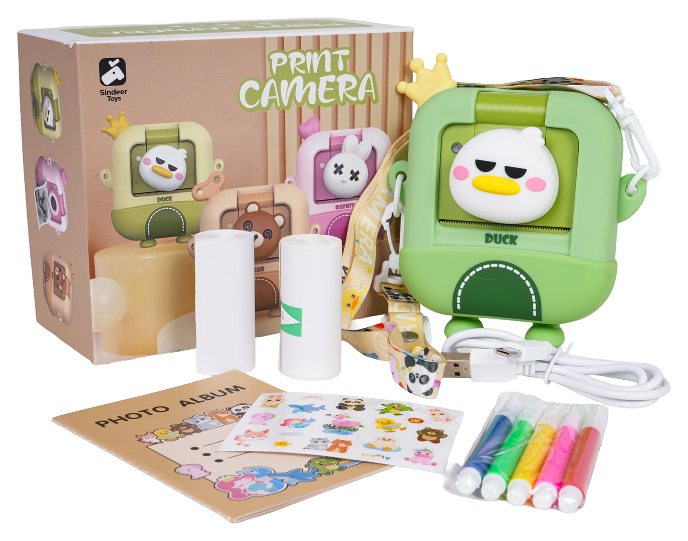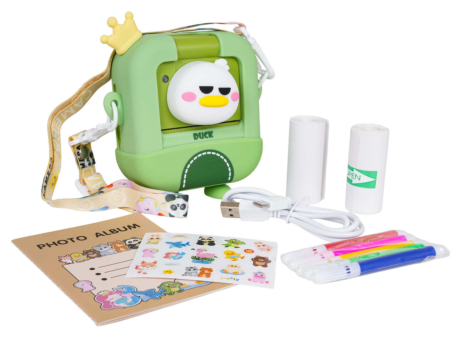 Die Sofortbild-Kinderkamera im Entchen-Look kombiniert einfache Bedienung, sofortigen Schwarzweißdruck und kreative Gestaltung. Das kompakte Gehäuse mit Tragegurt ist ideal für unterwegs, die Schutzhülle sorgt für sicheren Transport. Im Set ist alles enthalten, was Kinder für ihr eigenes Fotobuch brauchen – von Thermopapier über Stifte bis hin zu Album und Aufklebern.