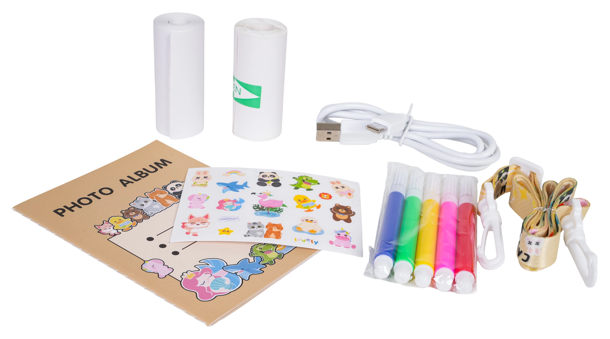 Fotoalbum, 2 Papierrollen, USB-Kabel, Trageschlaufe, Aufkleber und 5 bunte Stifte – die komplette Ausstattung für eigene Erinnerungen.
