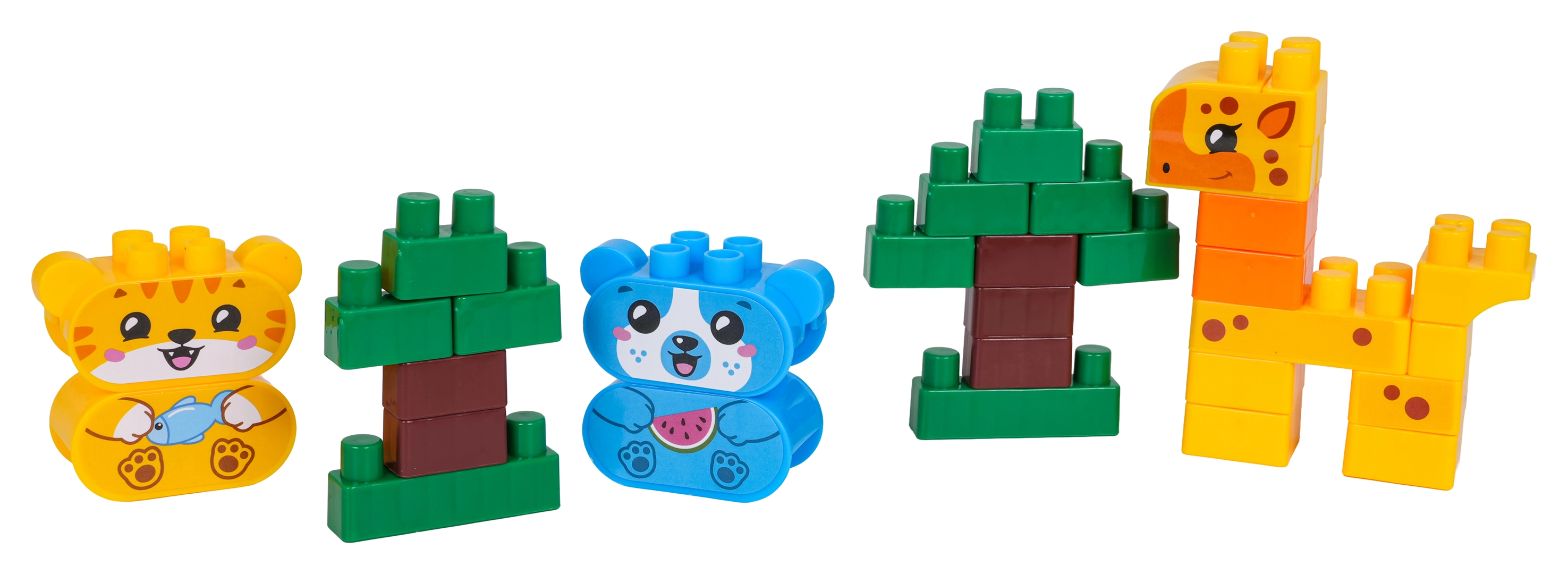 Die Bausteine fördern Fantasie, Hand-Auge-Koordination und kreatives Spiel. Im Lieferumfang sind außerdem dekorative Aufkleber enthalten, um das Aussehen der Tiere und der Szenerie zu vervollständigen.