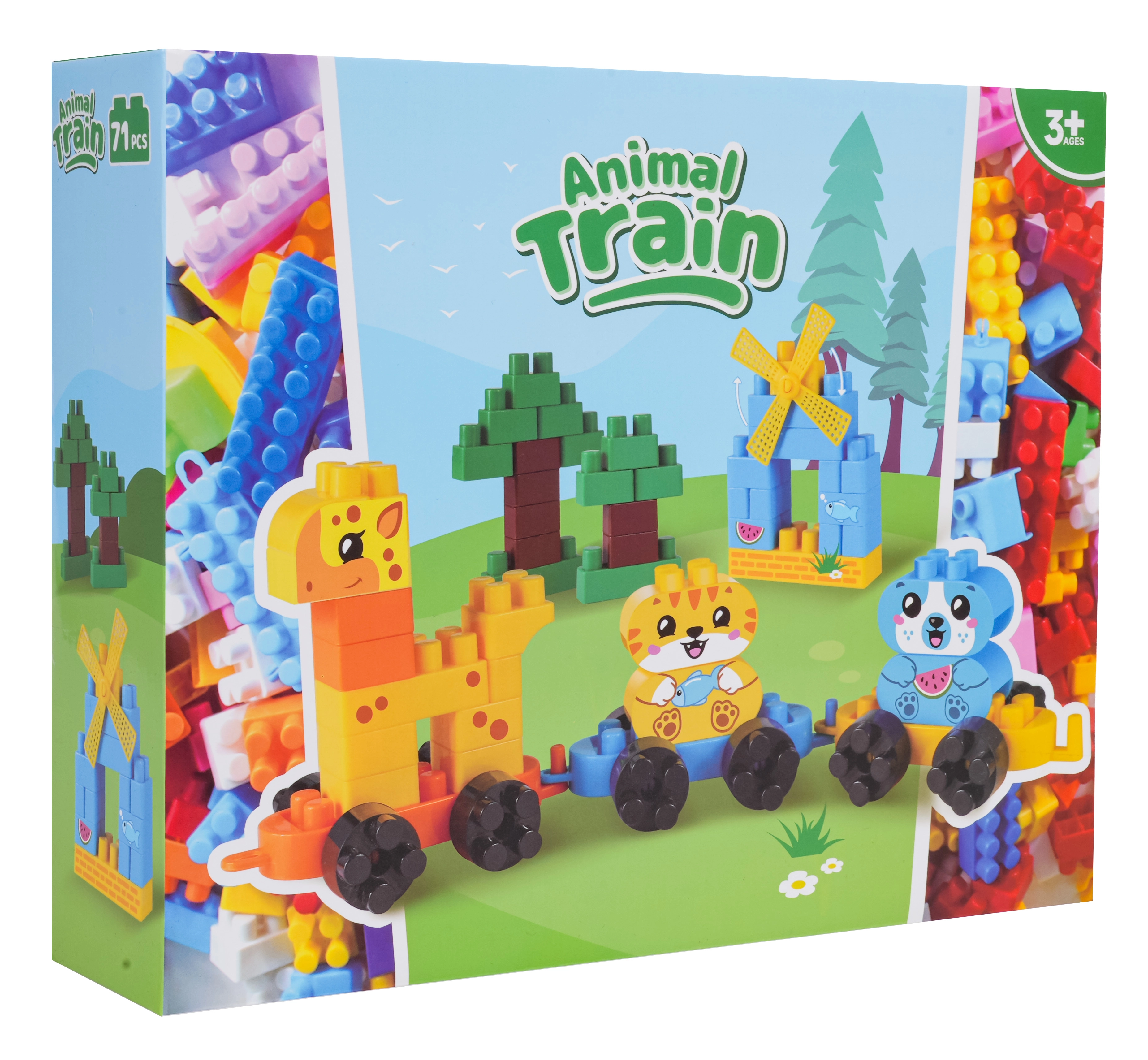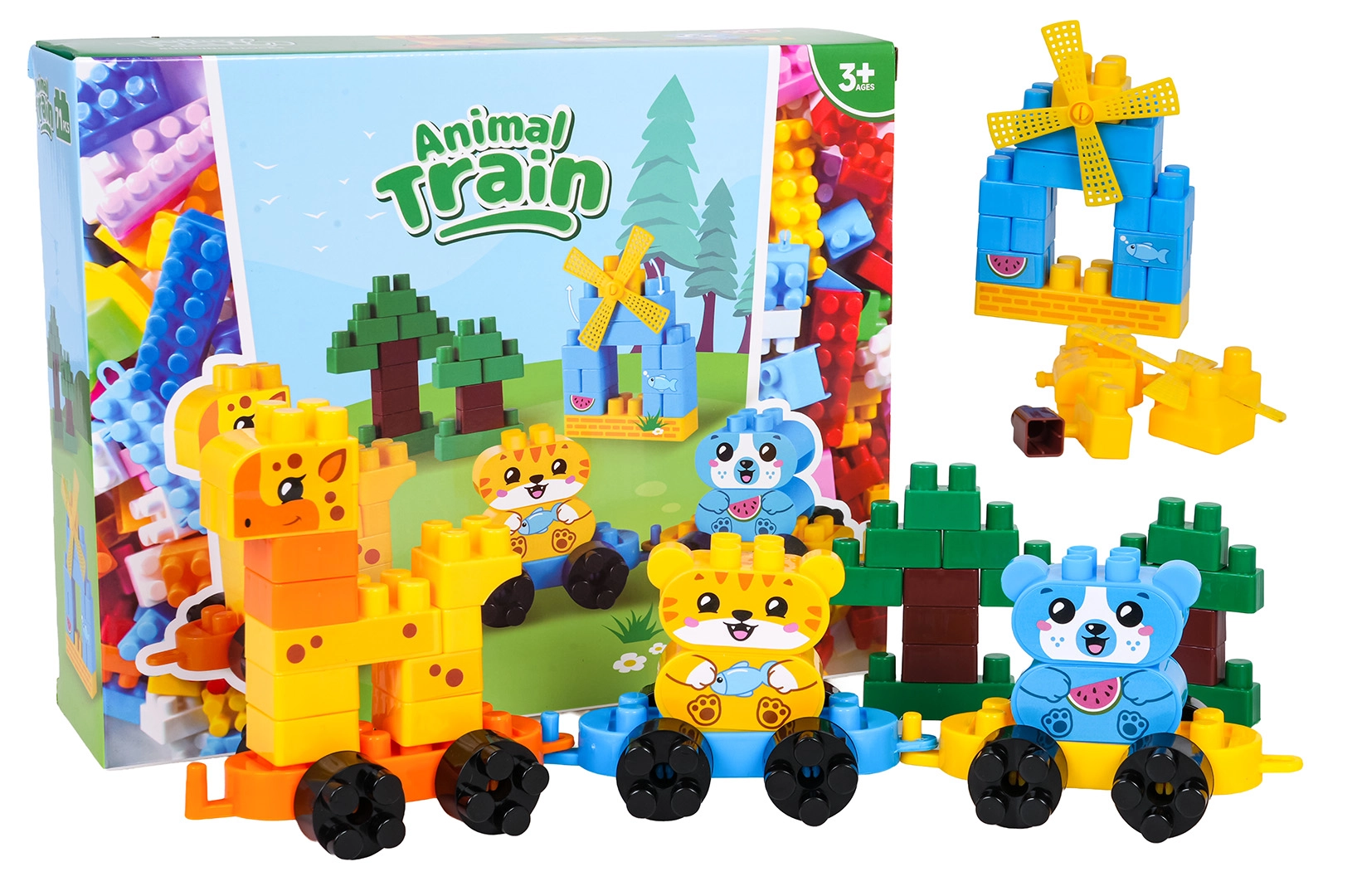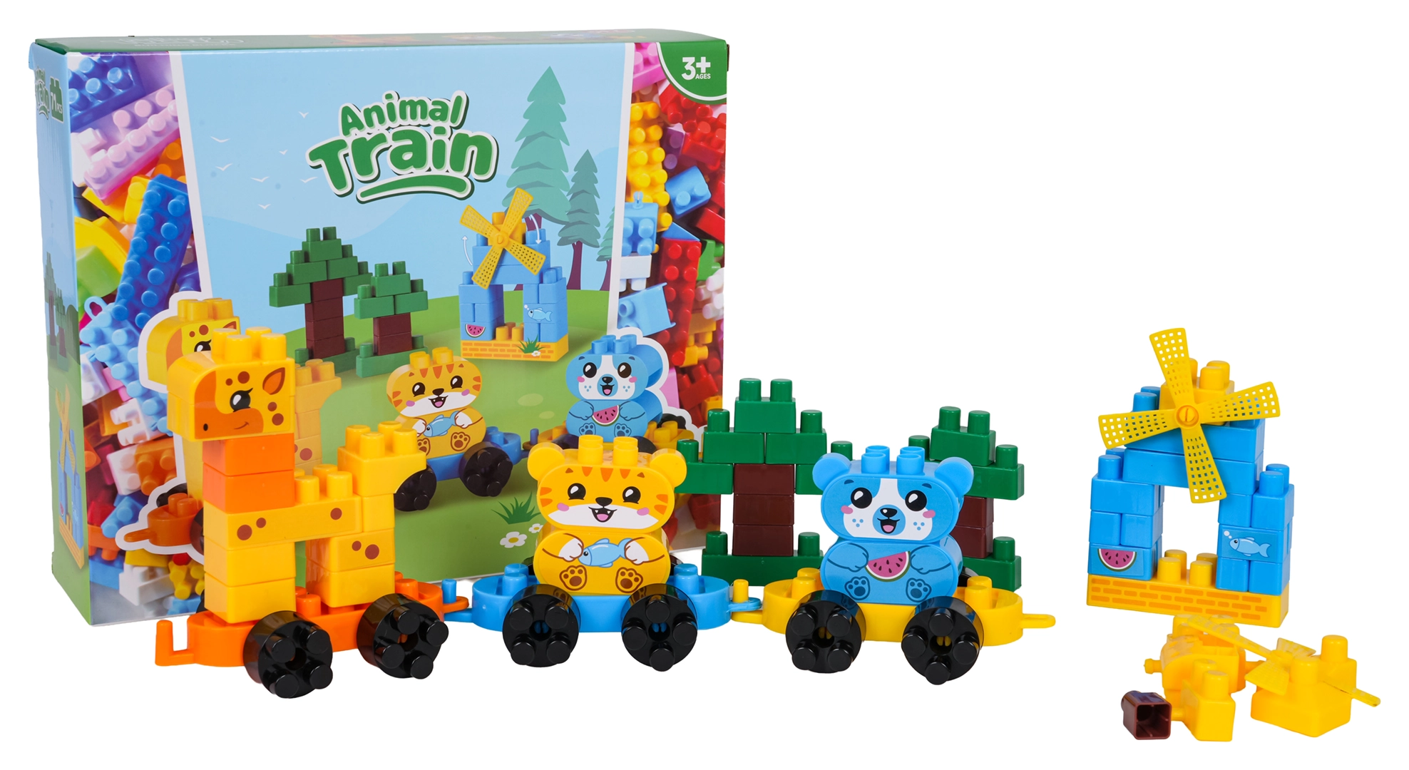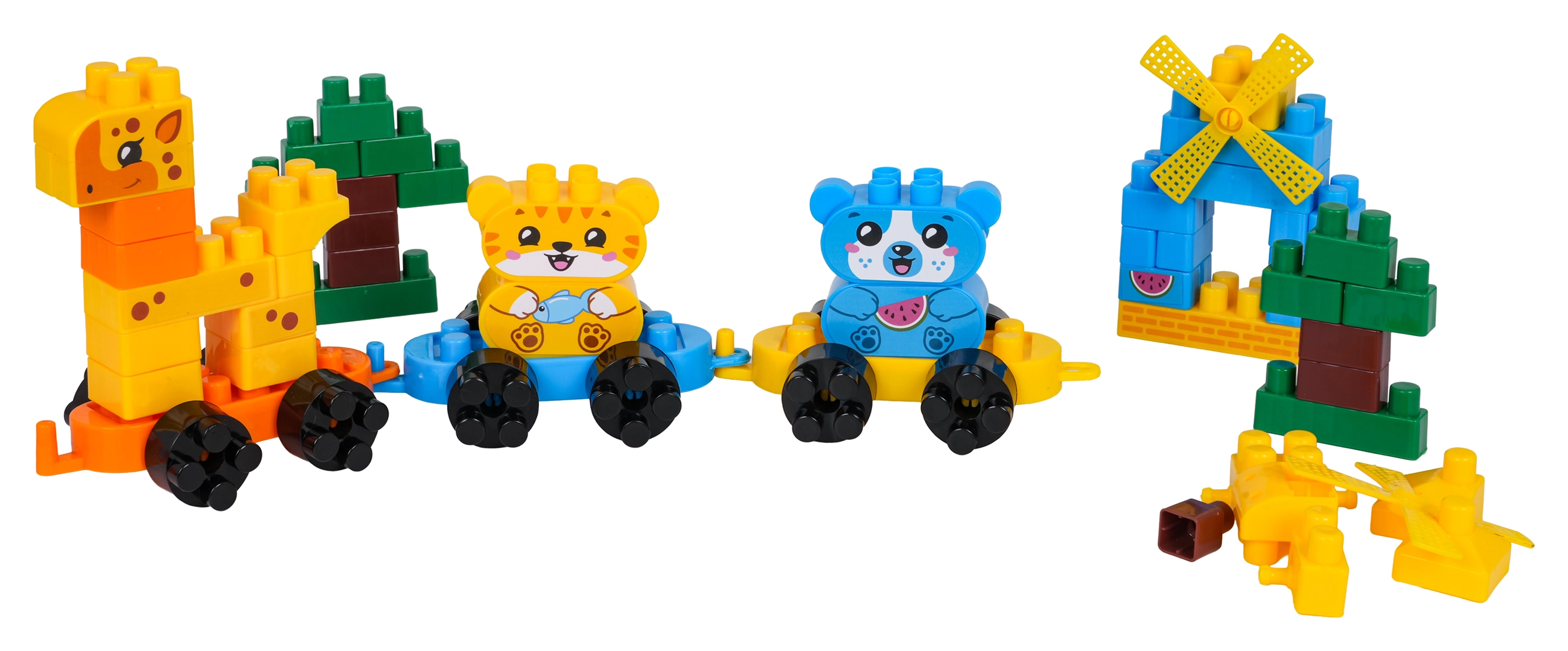 Entdecken Sie ein großes Set farbenfroher Bausteine, mit denen Kinder spielend leicht niedliche Tiere auf Fahrgestellen, Bäume und eine kleine Mühle bauen. Verbinden Sie die einzelnen Waggons und erstellen Sie einen ziehbaren Tierzug, der dank der Räder wirklich fährt. Das Set ist für kleine Baumeister ab 3 Jahren konzipiert – die Teile sind größer, liegen angenehm in der Hand und lassen sich hervorragend zusammenstecken.