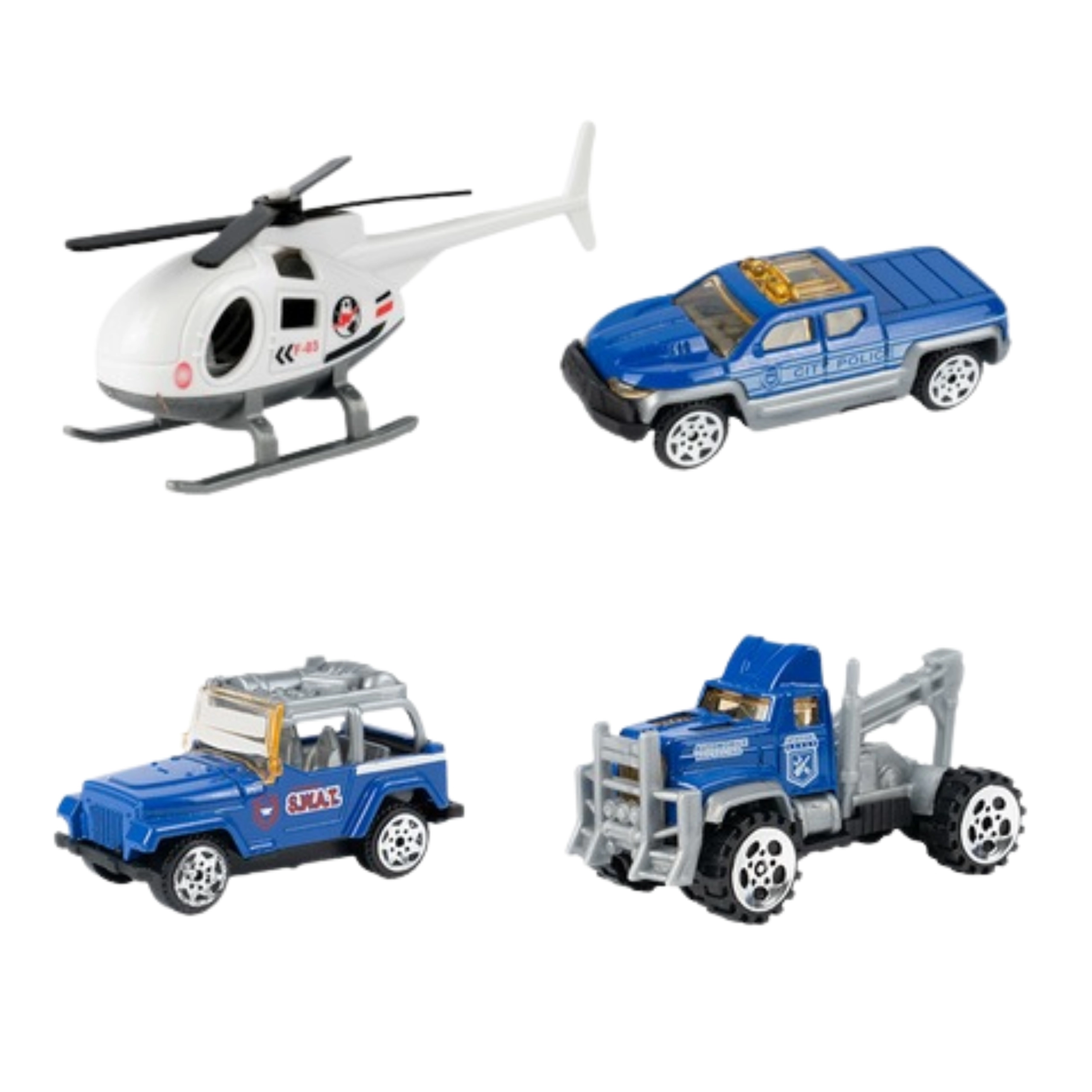 Enthalten sind 3 Metall-Polizeiautos (zufällige Modelle) und ein Polizeihubschrauber, sodass Kinder alleine oder mit Freundinnen und Freunden spielen können. Die stabile Konstruktion aus robustem Kunststoff und die leuchtenden Farben sorgen für sicheres und attraktives Spielen ab 3 Jahren.