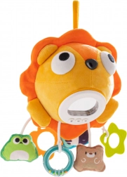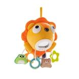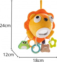 Am Körper des Löwen befinden sich 3 Bedientasten zum Ein- und Ausschalten der Beleuchtung, zum Wechseln der Melodien und zur Lautstärkeregelung. Enthalten sind hängende Elemente in verschiedenen Formen – darunter Beißring und Rassel – sowie ein Spiegel, der das Entdecken und die Hand-Auge-Koordination fördert.