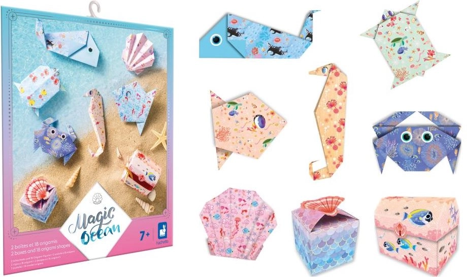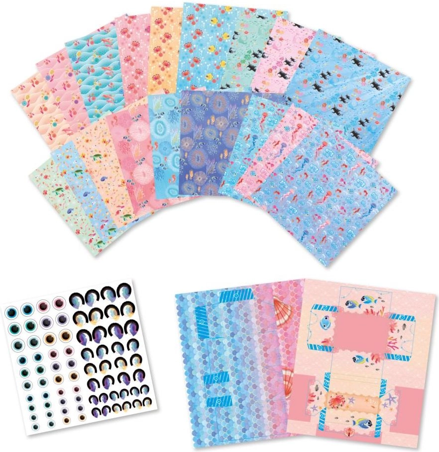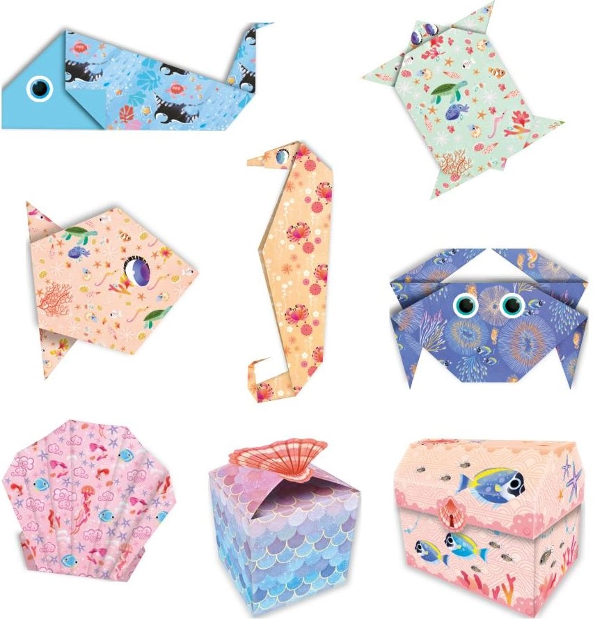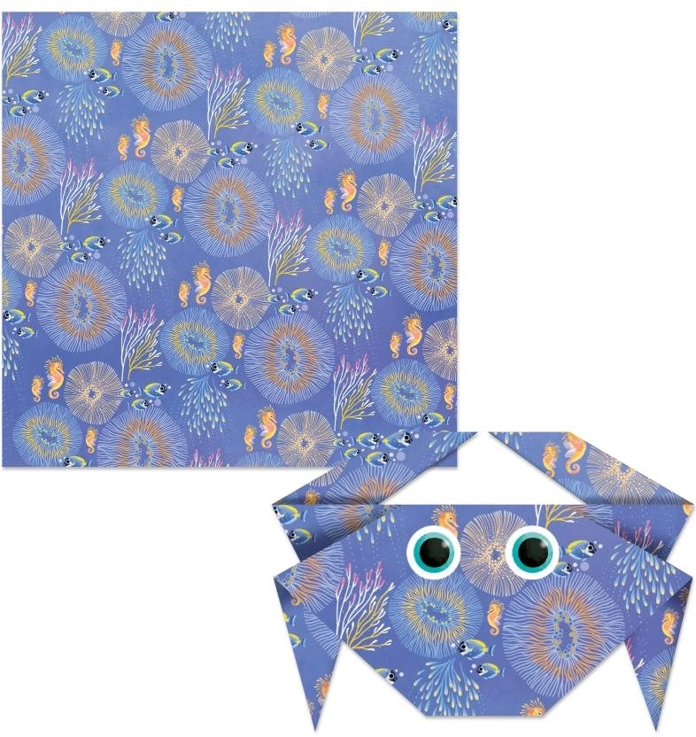 Das Set Mini-Origami Magischer Ozean bietet alles, was Sie für kreatives Papierbasteln brauchen: farbige Bögen mit Ozeanmotiven, einen Bogen mit Augenstickern und eine einfache Anleitung. Ideal für erste Schritte in der Welt des Origami und für kreative Nachmittage mit Kindern.
