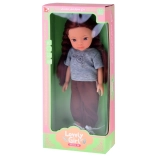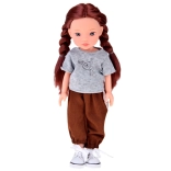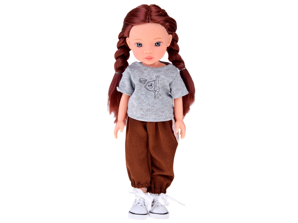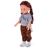 Die Puppe mit einer Höhe von ca. 33 cm ist aus hochwertigem Kunststoff gefertigt und dank artikulierten Armen, Beinen und Kopf leicht zu positionieren. Die langen, dichten satinierten Haare laden zum Kämmen, Flechten und Stylen ein. Ein lässiges graues T‑Shirt mit Print, braune Jogginghose mit weißen Seitenstreifen und weiße Sneaker runden den modernen sportlichen Look ab.
