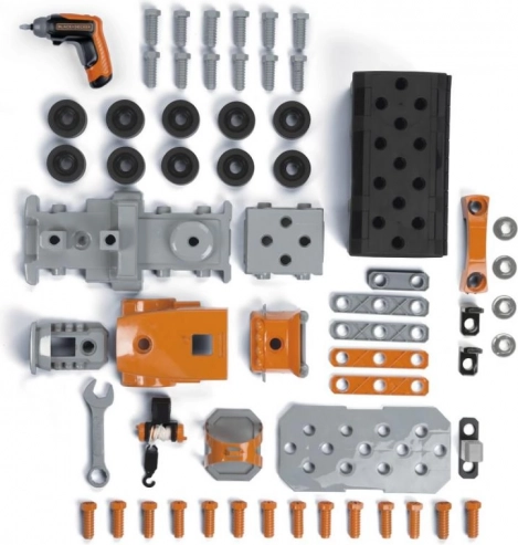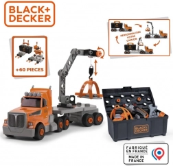 Dieser robuste LKW in den ikonischen BLACK+DECKER-Farben verbirgt im Anhänger einen praktischen Aufbewahrungskoffer mit Griff, der sämtliches Werkzeug übersichtlich zusammenhält. Kinder werden die realistische Kinderbohrmaschine und das umfangreiche Set an Aufsätzen und Bauteilen lieben.
